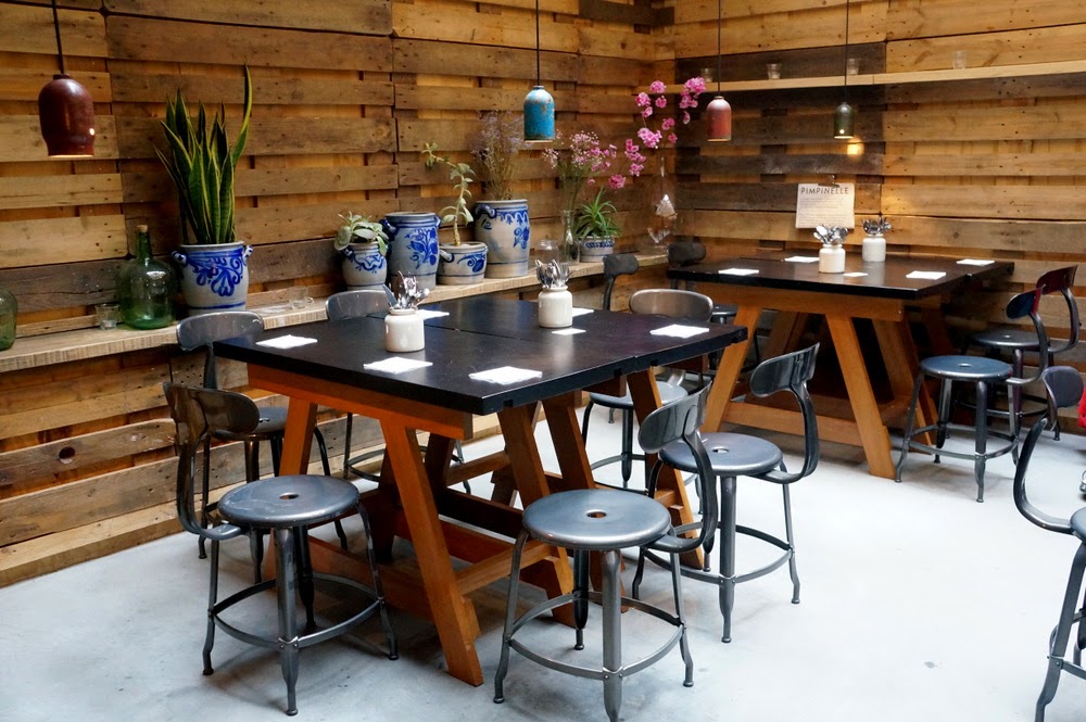 Mais surtout, je n’ai pas apprécié la disposition de la salle. Les murs recouverts de palettes m’ont donné l’impression de manger à l’intérieur d’une cagette; les tables pour deux rectangulaires, hyper longues, n’incitent ni aux conversations à bâtons rompus, ni aux bisous ou aux jeux de pieds, et comme elles sont très proches les unes des autres, je me suis retrouvée coincée dans ma chaise pendant tout le repas par mon voisin de derrière (nous étions dos à dos alors que même en tendant le bras, je pouvais à peine toucher le bout des doigts de Chouchou).