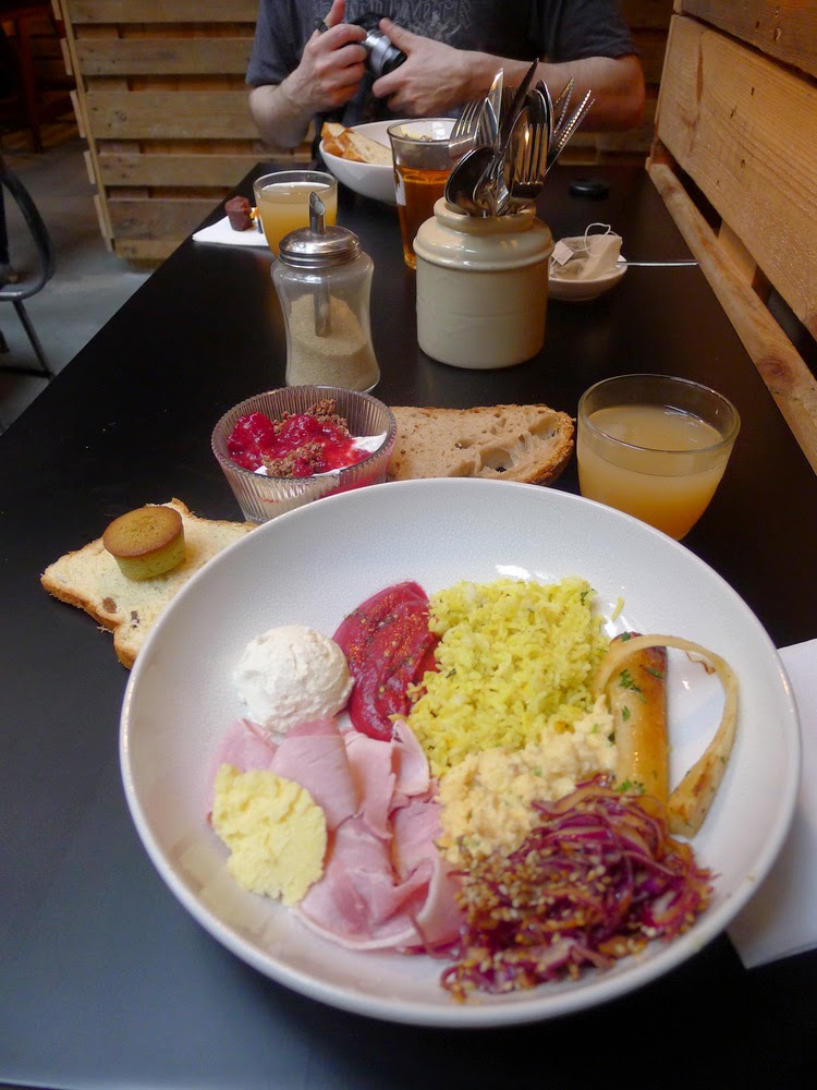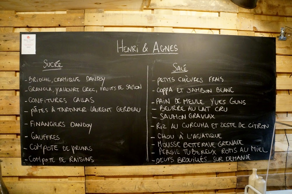 Henri & Agnès affiche le label Slow Food. Les produits fabriqués à l’extérieur viennent tous des meilleurs fournisseurs bruxellois (Dandoy ou Laurent Gerbaud dont le nom a été mal orthographié) (et, oui, j’ai aussi repéré la faute à « gaufres »), et les plats préparés sur place l’ont visiblement été avec des ingrédients de qualité. Rien à redire sur la partie sucrée, à part peut-être l’absence de viennoiseries; la partie salée, en revanche, m’a paru manquer un peu de recherche en termes d’ingrédients et de saveurs. Tout était bon, mais aucun plat ne m’a arraché de soupir de bonheur.