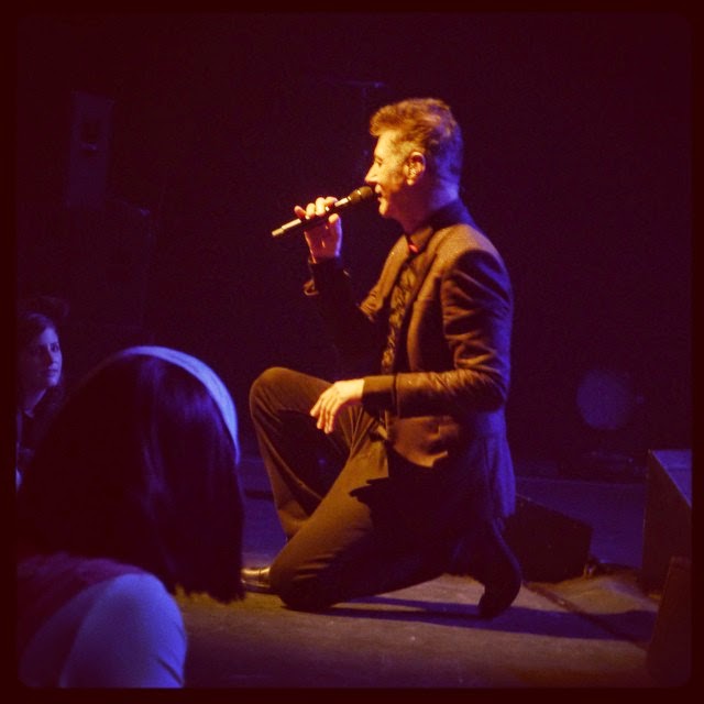 Pendant une heure 40 environ, Etienne Daho alterne avec bonheur ses plus grands tubes (« Epaule tattoo », « Tombé pour la France », « Le grand sommeil », « Saudade », « Bleu comme toi », « Heure hindoues », « Comme un boomerang »…), des morceaux moins connus (« Soleil de minuit » ou « Il ne dira pas ») et des extraits de son dernier album studio (« La peau dure », « En surface », « L’homme qui marche », « Les chansons de l’innocence »). Il transpire abondamment dans son costume sombre; ses cheveux grisonnent maintenant, et les contours de son visage accusent sa presque soixantaine. Mais il n’a rien perdu de son élégance de dandy de la pop, et si la pure légèreté d’autrefois s’est mâtinée d’une certaine gravité avec l’expérience, je ne crois pas l’avoir jamais vu prendre un plaisir aussi évident sur scène. La scénographie hyper sobre laisse la part belle au son qui, franchement, déménage grâce aux excellents musiciens dont Daho a toujours su s’entourer. Les décennies écoulées n’ont terni ni son sourire en coin un peu timide, ni l’éclat pétillant de ses yeux; elles n’ont pas entamé le mélange de grâce et de sexytude avec lequel ses bras ondulent et son corps svelte se déhanche. Comme la salle refuse de le laisser partir après deux rappels, pour finir, Etienne Daho s’agenouille au bord de la scène et entonne « Week-end à Rome » a capella, en duo avec les centaines de personnes qui viennent de lui faire une longue ovation. Petit moment magique qui me vaudra ma seule photo réussie de la soirée. Ciao, Etienne. On se revoit pour ta prochaine tournée.
