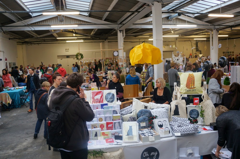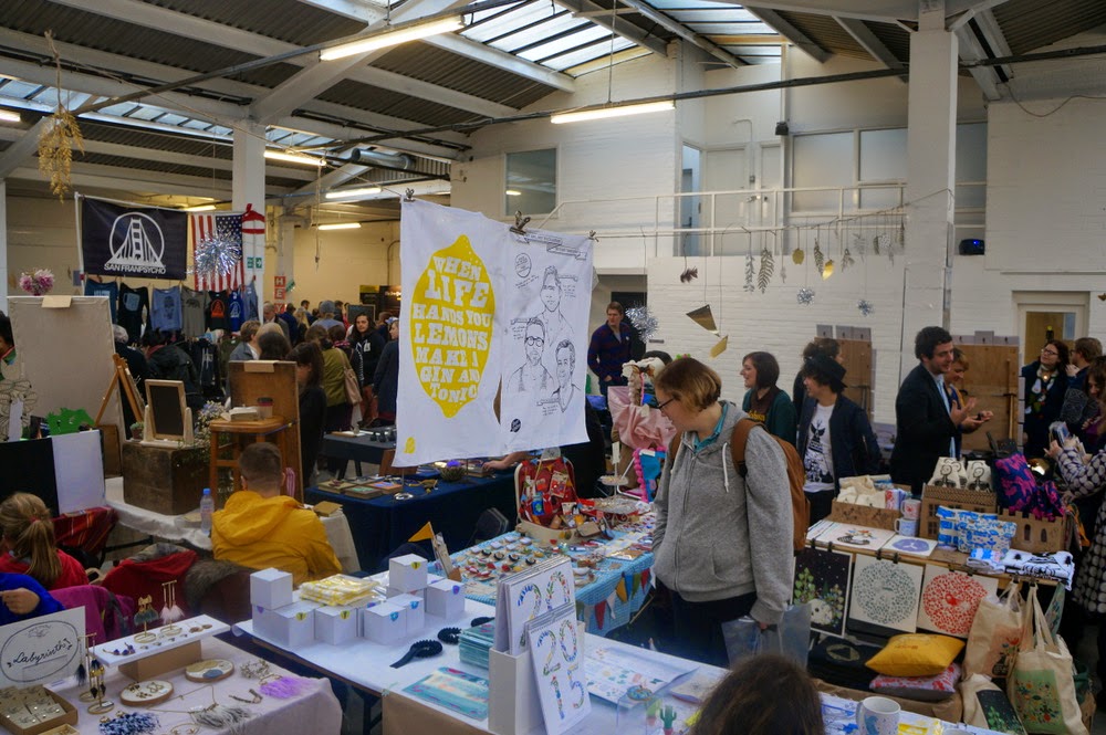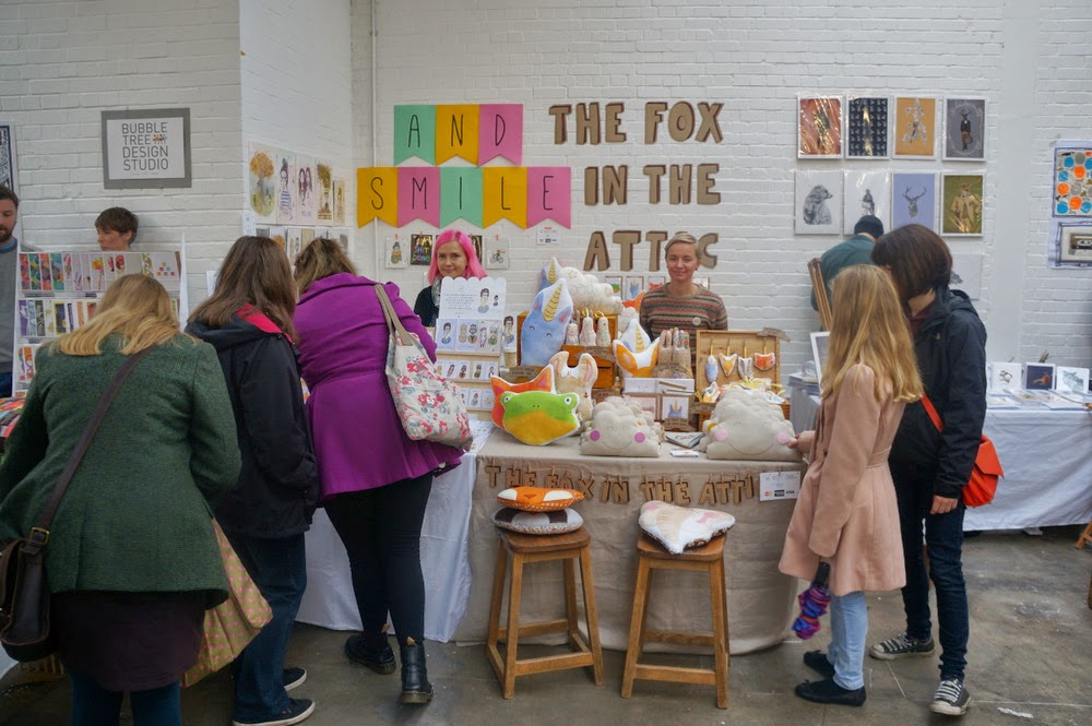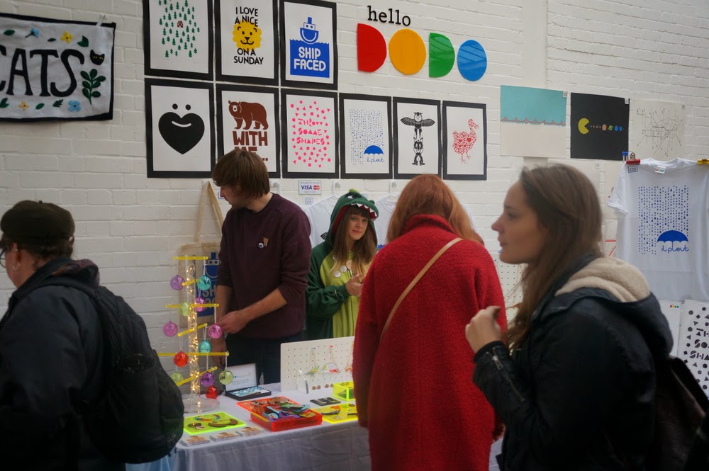 La Renegade Craft Fair, c’est un marché de créateurs qui se tient chaque année dans plusieurs villes des USA (New York, Los Angeles, San Francisco, Chicago et Austin), mais aussi à Londres, généralement fin novembre. En Grande-Bretagne, l’événement est sponsorisé par les magazines Mollie Makes et The Simple Things, ce qui donne une assez bonne idée du style des exposants. Pour le dark et le contestataire, on repassera: la Renegade Craft Fair, c’est le royaume des Twee, ces « nouveaux gentils » qui aiment les animaux des bois, les licornes et le rétro mignon. C’est à peine si j’ai repéré un ou deux stands qui osaient l’humour sarcastique. Cette homogénéité se retrouvait dans le public, essentiellement composé de jeunes femmes romantiques et de couples de hipsters. La salle grande et lumineuse, située dans le quartier en voie de gentrification de Spitalfields, offrait un cadre parfait à la manifestation: malgré la foule qui s’y massait dès la première heure d’ouverture, le samedi, on arrivait à circuler à peu près convenablement.