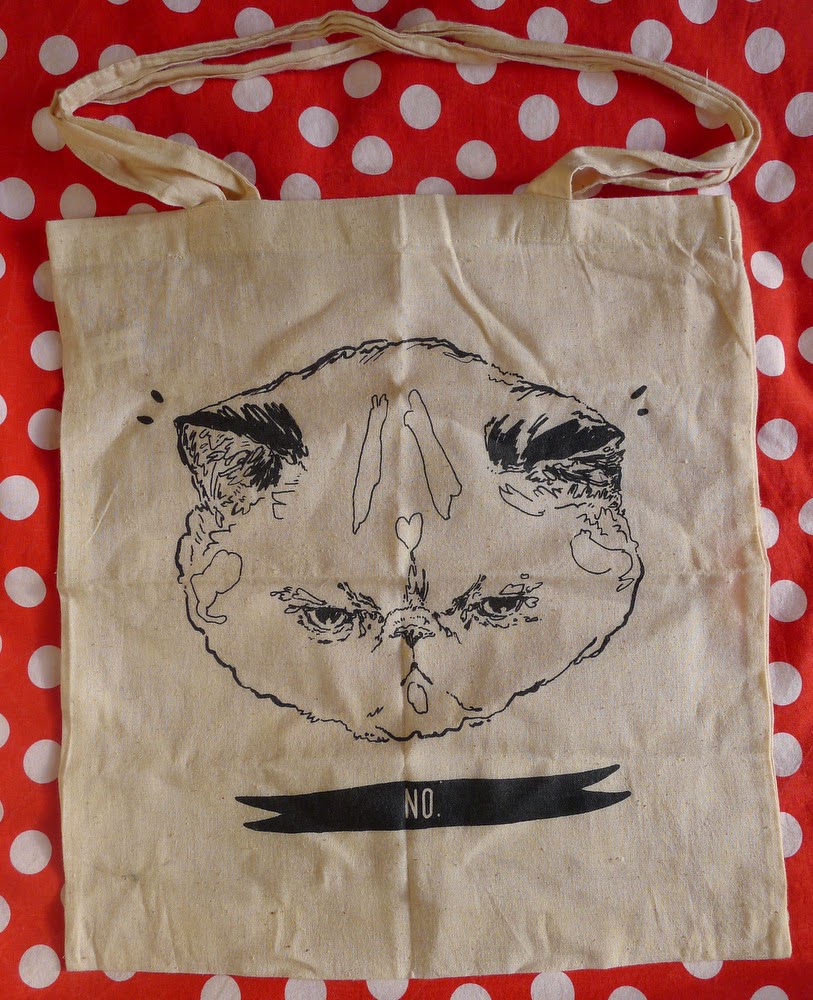 Enfin, comme un de mes sacs de shopping en papier s’était déchiré la veille, répandant son contenu sur le trottoir dans une flaque de pluie, j’ai pensé que ce serait bien d’investir dans un tote bag (à Bruxelles, j’en ai toujours un dans mon sac, mais j’avais oublié de l’emporter). Sur le stand de Hello Harriet, j’hésitais entre deux modèles: Chouchou m’a impérieusement désigné celui-ci en me disant « C’est tout toi ». Euh, OK, alors. Dommage qu’on ne retrouve dans leur boutique Etsy qu’une petite partie des produits que j’ai admirés ce week-end (les tattoos temporaires lapins, en particulier, sont très choupinets).
