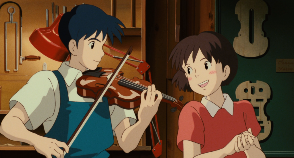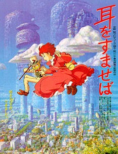 C’est à l’occasion de l’expo sur le studio Ghibli à la galerie Art Ludique que j’ai découvert l’existence de « Si tu tends l’oreille« , film passé inaperçu en Europe – probablement parce qu’Hayo Miyazaki n’en est pas le réalisateur, même s’il s’est beaucoup impliqué dans ce projet et que ça se sent. On retrouve ici bon nombre des thèmes chers au maître, aussi bien visuellement que scénaristiquement. Il y a des vues plongeantes magnifiques, des ciels immenses pleins de nuages, des paysages urbains charmants, une scène fantasmagorique qui ressemble à un niveau de Super Mario Galaxy, un gros matou qui se déplace en métro et aime bien faire bisquer les chiens du quartier, une boutique pleine de trésors enchanteurs, une figurine de chat aristocrate à l’histoire romanesque, un vieux réparateur d’horloges qui dispense sa sagesse à l’héroïne, un jeune fabricant de violons qui rêve de faire son apprentissage à Crémone, une métaphore sur le joyau caché dans la pierre brute au coeur de chacun d’entre nous. C’est l’histoire des premiers émois amoureux d’une jeune fille ordinaire, mais aussi et surtout, de la façon dont elle trouve sa voie – et puis aussi, un peu, une ode aux artisans et aux artistes, et à tous ceux qui travaillent dur pour vivre leur passion. Une très jolie surprise tous publics.