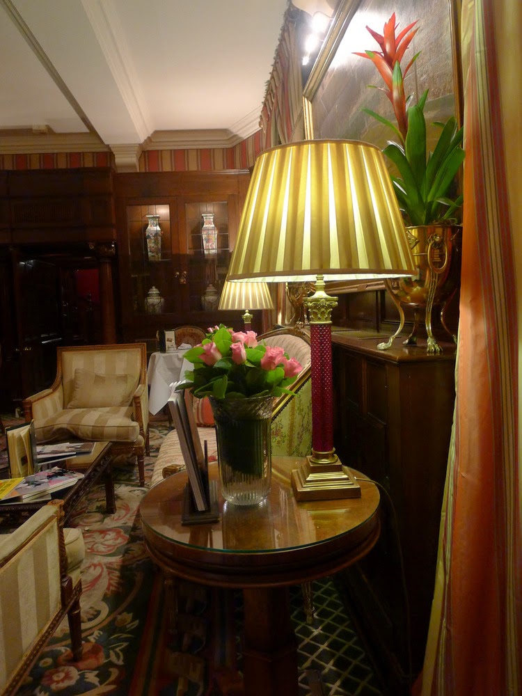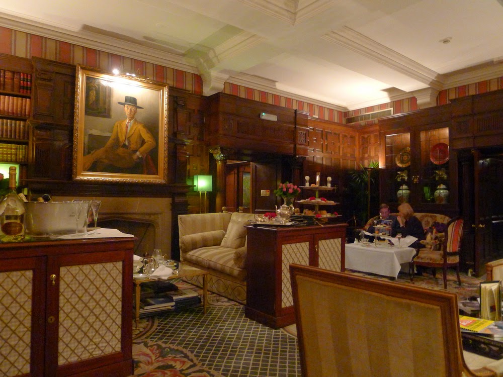 Le jour venu, j’ai bien cru que jamais nous ne trouverions le Milestone Hotel. Il me semblait me souvenir que le site internet indiquait « 200m sur la droite en sortant du métro », mais je n’ai rien osé dire et j’ai suivi le GPS de l’iPhone de Chouchou qui nous a baladés sous la pluie, dans le froid, l’obscurité et des rues désertes pendant trois quarts d’heure. Lorsque nous avons finalement déboulé dans le hall d’un hôtel très chic, haletants et trempés de sueur, nous avions une demi-heure de retard. Nous n’avions pas eu l’occasion de nous changer; Chouchou était en sweat Gap/jean/Dr Martens, alors que le dress code de l’établissement stipule qu’on doit être « elegantly dressed ». J’ai cru que le serveur allait nous éconduire avec un petit reniflement hautain. Pas du tout, il nous a fait un grand sourire, a balayé mes excuses d’un aimable « no problem at all » et nous a conduits à une petite table dans le coin du fond, sans doute celle que j’aurais moi-même choisie si on m’avait laissé faire. De là, nous avions une excellente vue sur le reste de la salle; nous étions loin de la cheminée (de toute façon éteinte) mais près d’une jolie fenêtre encadrée de rideaux douillets, et surtout, nous étions assis à une table « à manger » plutôt qu’autour d’une table basse qui nous aurait obligés à nous mettre dans une position malcommode pour déguster notre goûter. Si j’étais venue avec un groupe de copines, je pense que j’aurais apprécié les canapés, mais là, pour un tête-à-tête d’amoureux, c’était parfait!