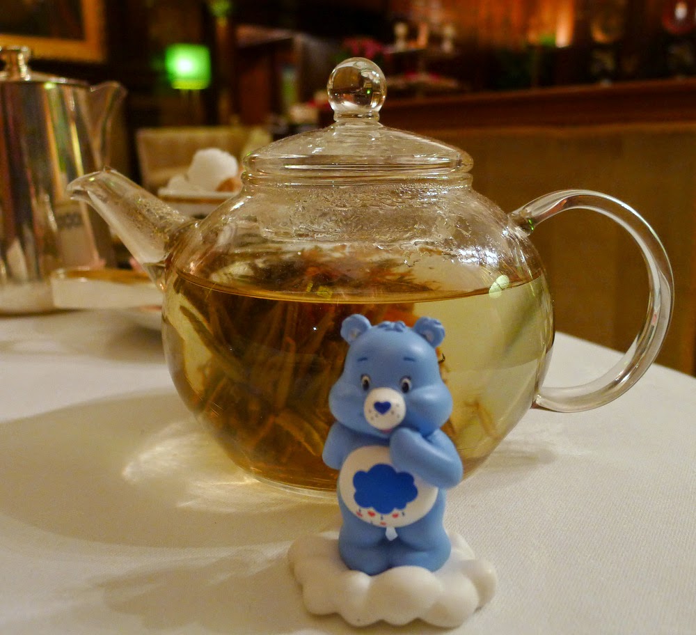 Nous avons opté pour le « traditionnal tea » – ajouter une flûte de champagne, voire des fraises à la chantilly, ne m’aurait pas déplu, mais l’option de base représentait déjà un certain investissement… Parmi la carte des thés assez bien fournie, et pas seulement en thés noirs/anglais, Chouchou a pris un Darjeeling et moi une fleur de thé blanc au chrysanthème. (Plusieurs fois durant l’heure et demie suivante, les deux serveurs se sont relayés pour remettre de l’eau chaude dans nos théières, puis pour changer le thé après trois infusions.)