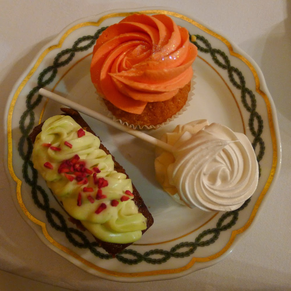Côté gourmandises: nous avons reçu pour deux un présentoir à gâteaux contenant douze finger sandwiches (des sandwiches au pain de mie, mais garnis d’ingrédients d’une super qualité, notamment un saumon dont Chouchou m’assure qu’il déchirait sa mémé poisson), une douzaine de mini-pâtisseries toutes différentes, aux saveurs recherchées et franchement sublimes (hélas, nous n’avons réussi à en manger que la moitié) et quatre scones (pas terribles, à ma grande déception) accompagnés d’une confiture de fruits rouges maison et d’une clotted cream tellement épaisse que la petite cuillère tenait à la verticale dedans. Le problème, c’est que j’ai calé assez vite et vraiment eu l’impression de gaspiller. Il est possible de demander une boîte pour emporter ce qui n’a pas été consommé sur place, et j’apprécie beaucoup l’initiative, mais ce n’est pas nécessairement pratique quand on est déjà chargé et qu’on loge dans une chambre d’hôtel sans frigo. Du coup, l’addition a eu un peu de mal à passer: à £36.50 par personne, plus le service, nous en avons tout de même eu pour environ 55€ chacun, un prix que je ne mets que rarement même dans un dîner au resto. Ca fait cher le goûter.