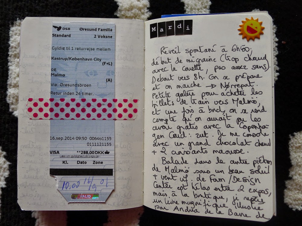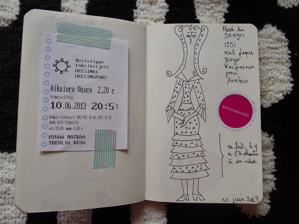 Quand je m’en suis rendu compte, j’ai eu une période de découragement où je n’ai plus rien fait. Et puis l’année dernière à Helsinki, j’ai fini par m’y remettre avec un tout petit Moleskine 9×14, à la fois peu encombrant et facile à remplir même en quelques jours. J’ai opté pour une version minimaliste: un peu de texte, des collages, quelques croquis et basta. On est très loin des carnets de voyage magnifiques publiés par certains éditeurs, mais ça ne me demande pas trop de temps, c’est du souvenir pris sur le vif (avec juste une heure de finalisation après le retour de vacances), et ça a le mérite d’exister et d’être fini. Aussi, j’ai pensé qu’il serait sympa d’écrire un article là-dessus pour celles d’entre vous qui aimeraient bien faire des carnets de voyage mais ne savent pas trop comment s’y prendre et sont un peu intimidées par le processus.