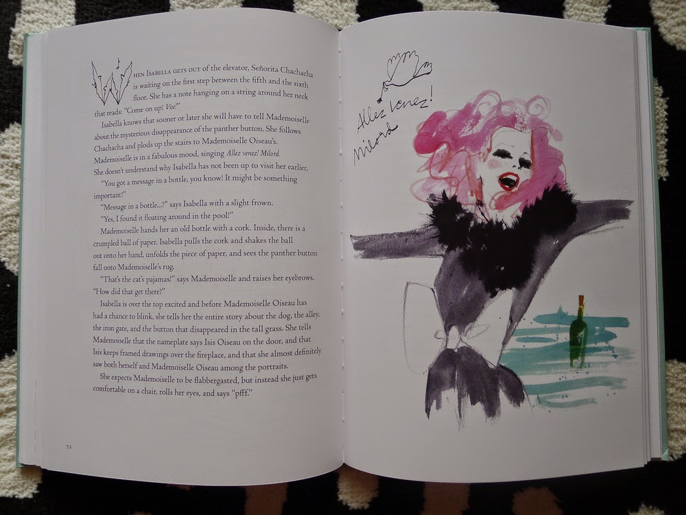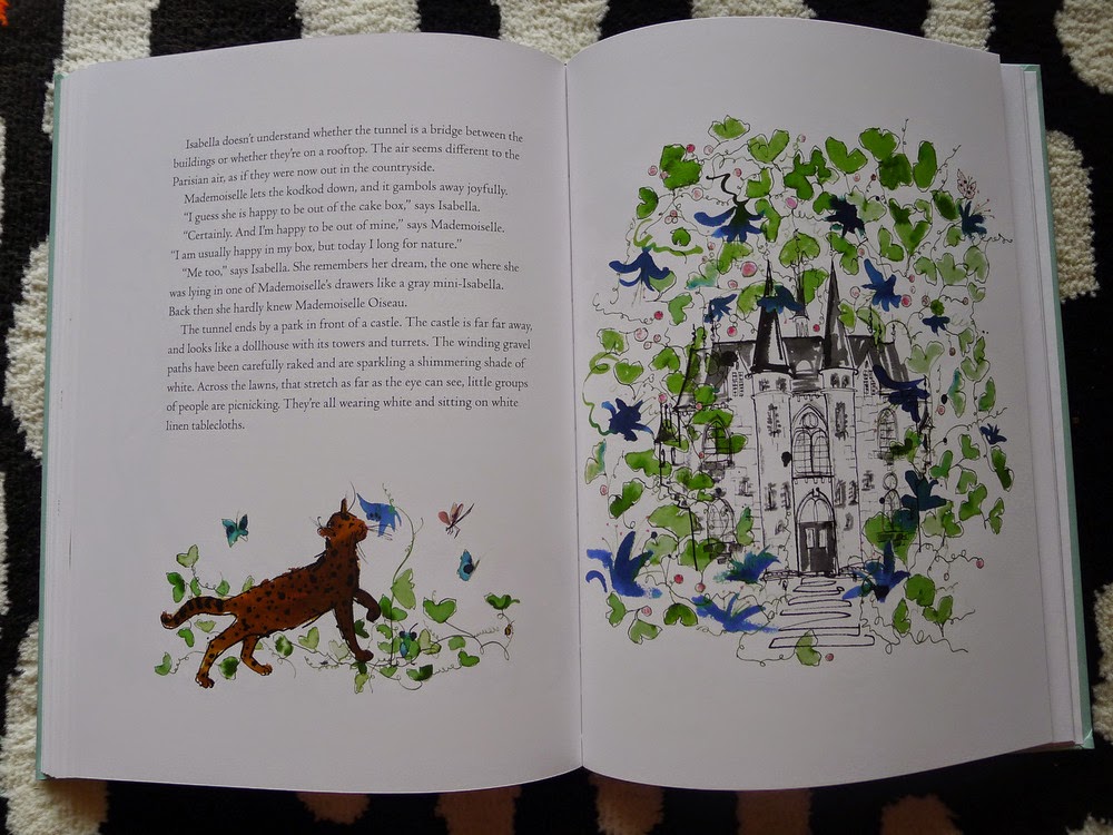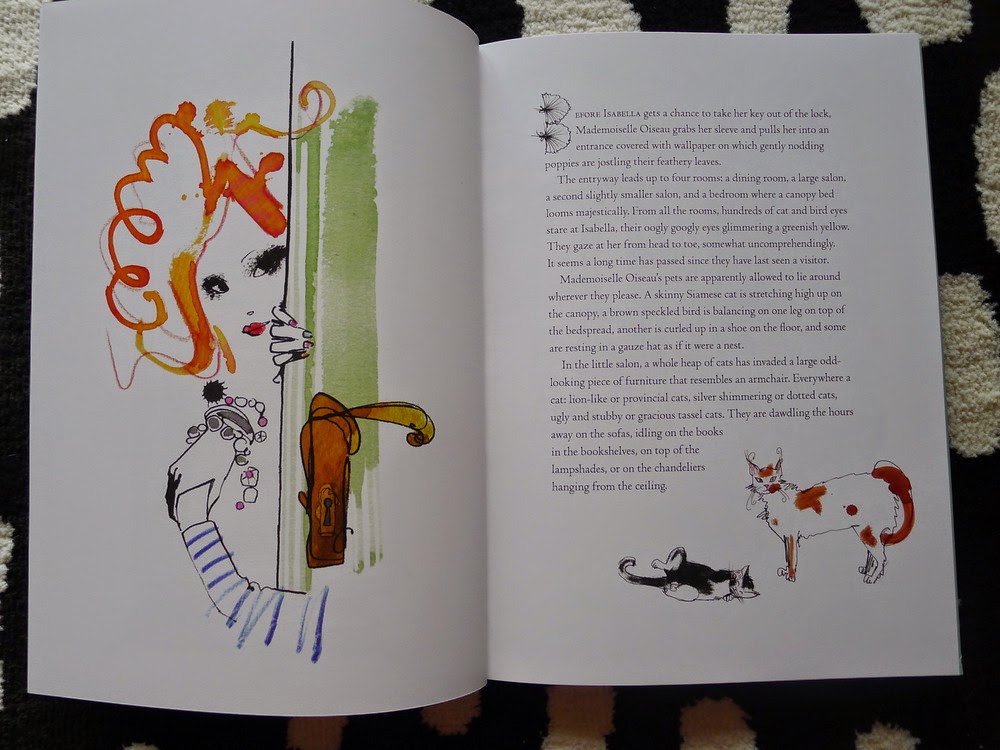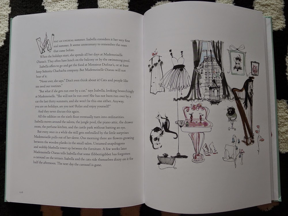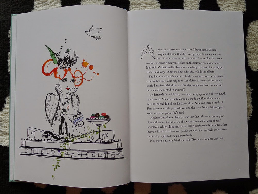 Mademoiselle Oiseau, donc, vit à Paris, au dernier étage d’un immeuble avenue des Temps Perdus. Nul ne connaît son âge: bien qu’elle semble jeune et élégante, on chuchote qu’elle habite là depuis près d’un siècle. Mais à vrai dire, c’est à peine si on l’aperçoit de loin quand elle sort sur sur balcon. Car Mademoiselle Oiseau ne met jamais les pieds hors de chez elle. Tous les midi, elle envoie l’un de ses nombreux chats lui chercher une quiche aux poireaux et un macaron à la boulangerie du coin. Et elle vit ainsi en recluse jusqu’au jour où la petite Isabella, gamine terne de 9 ans qui habite juste en dessous de chez elle, vient sonner à sa porte. Emerveillée, Isabella découvre un appartement plein de pièces qui ne peuvent pas exister, où la cuisine sert uniquement à concocter des parfums et où une passerelle aérienne conduit vers un château hors du temps…