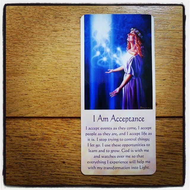 Pour 2015, j’ai très longtemps hésité, et même pensé un moment que je ne renouvellerais pas l’exercice parce qu’aucun mot ne me « parlait ». Ou plutôt, le seul qui me parlait me rebutait aussi pas mal. Je savais que la prochaine étape de mon développement personnel passerait par un certain lâcher-prise, et je savais aussi que ce serait quelque chose de très difficile à travailler pour moi qui suis totalement psychorigide, avec une idée bien précise de la manière dont les choses devraient fonctionner. Sauf que mes idées précises ne suffisent pas à modeler le monde (croyez bien que je le déplore: ce serait un endroit nettement plus juste et plus paisible, où les administrations fonctionneraient comme un charme et où rien ni personne ne serait jamais en retard). Et qu’au final, elles nuisent donc à mon bien-être, car même si j’ai partiellement dompté la colère qui m’habitait, je continue à m’énerver contre les contrariétés qui auraient facilement pu être évitées, les imprévus qui foutent mes plans en l’air, les gens qui font preuve de négligence, d’inefficacité ou se conduisent d’une manière que j’estime stupide. Puisque je ne peux rien changer à tout ça, il serait bon que j’apprenne à l’accepter gracieusement, à intégrer le fait que les contrariétés et les imprévus font partie de la vie, que les gens ont leurs raisons d’agir comme ils le font et qu’il vaut mieux soit essayer de les comprendre, soit réussir à les ignorer. Bref, j’aimerais cesser d’être en guerre contre tout ce qui ne correspond pas à ma conception des choses. Un vaste programme, très bien résumé par l’angel card que j’ai tirée à la fin de mon dernier cours de yoga. Je ne suis pas encline à voir des signes partout, mais j’avoue que son texte et son illustration ont provoqué un déclic chez moi: « C’est CA que tu dois faire en 2015, et tu le sais ». Dont acte.