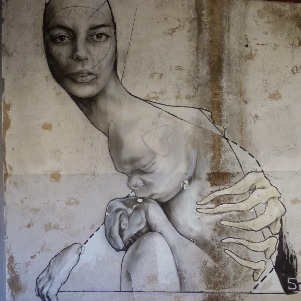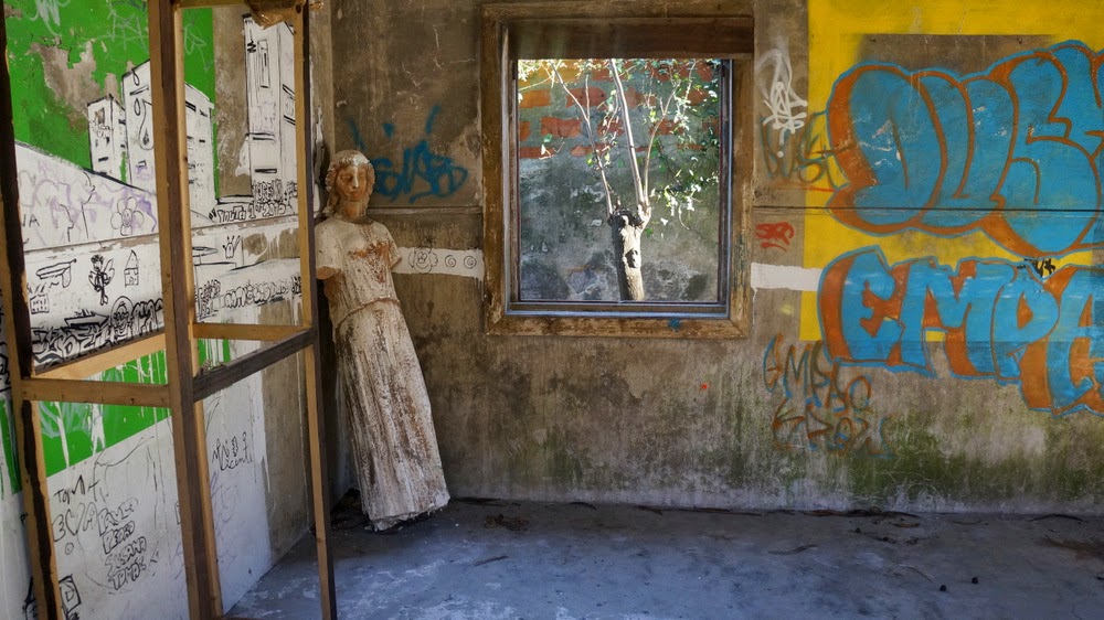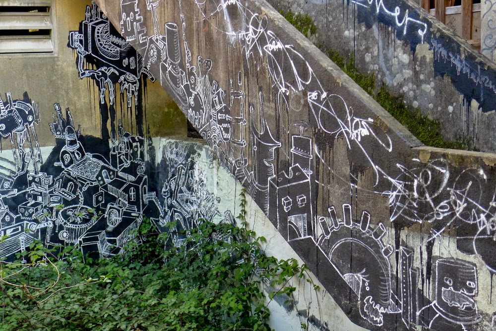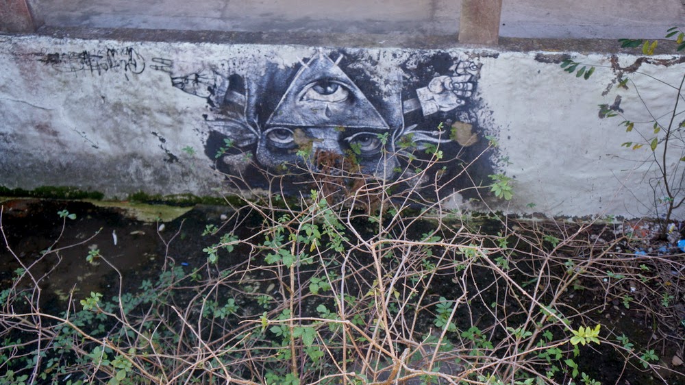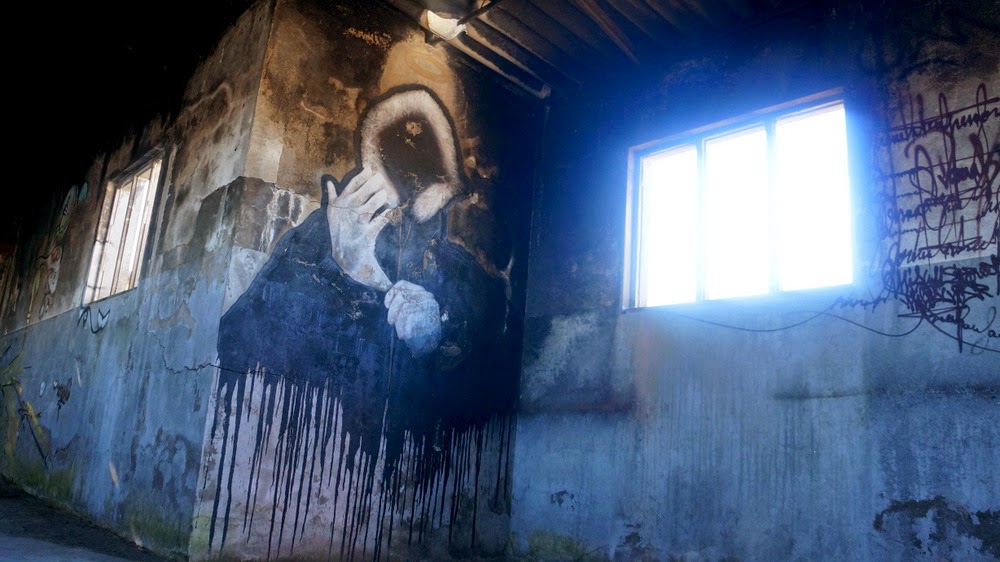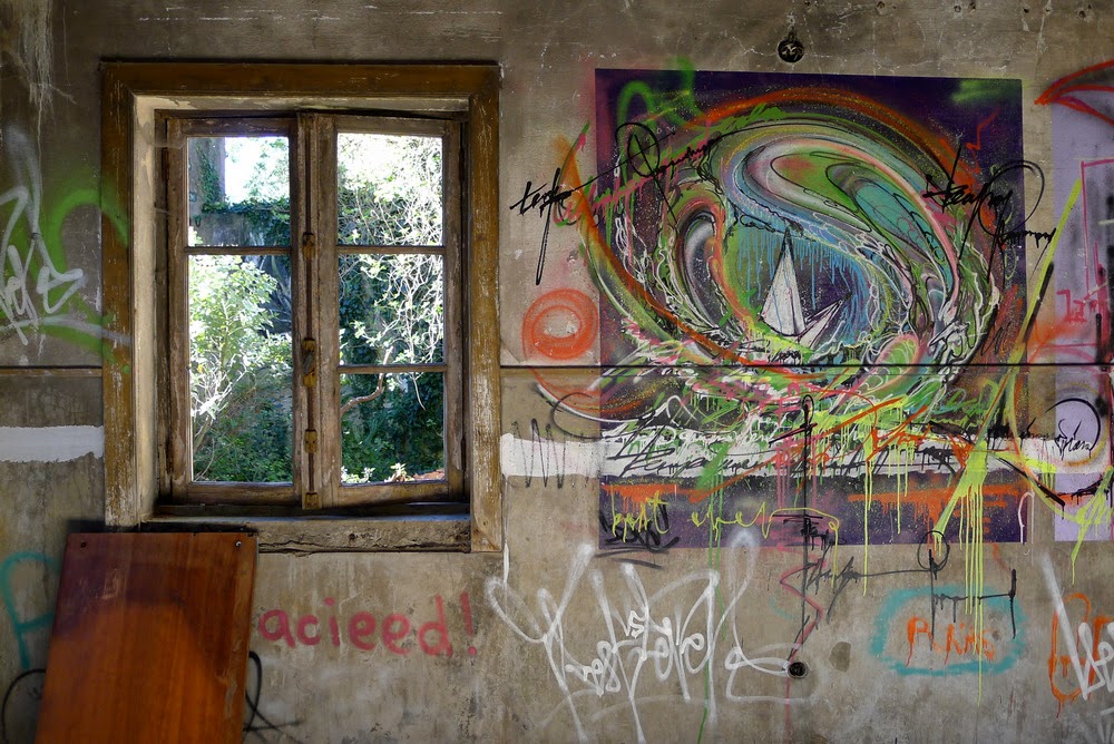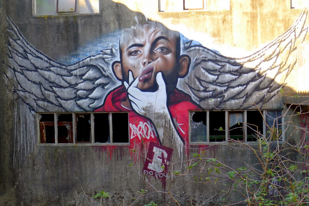 Voici bien un endroit où je n’aurais jamais mis les pieds sans le geocaching! Il faut dire que la Fabrica Social, fondation artistique créée par le sculpteur portugais José Rodrigues, est située quelque peu à l’écart des sentiers battus, tout en haut de la rua Santa Catarina (interminable artère piétonnière commerçante dépourvue de charme comme d’intérêt). Il faut aller la chercher au sommet d’une volée de marches passablement crevante et au fond d’une impasse bien planquée – aucune chance de tomber dessus par hasard! Mais si on la contourne pendant les heures d’ouverture, on accède à l’un des lieux les plus étranges et méconnus de Porto: un ensemble de maisons en ruines devenu un haut lieu du street art. Les plus grands artistes du pays y ont signé des oeuvres étranges, parfois choquantes, souvent troublantes mais toujours photogéniques…
