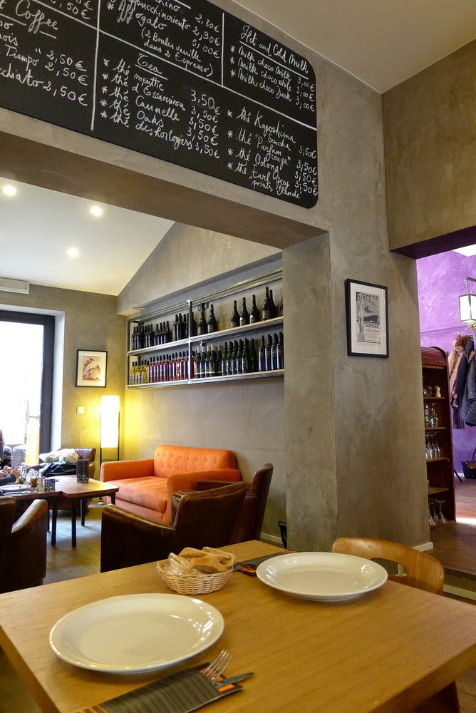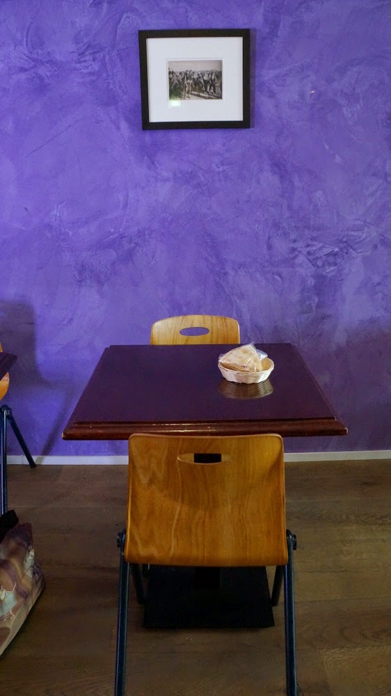 Le restaurant se compose de deux salles en enfilade. La première, assez étroite, abrite le buffet et, dans le fond, un coin lounge avec canapés et tables basses. La seconde, plus large et plus lumineuse, a des murs peints en violet. Les deux sont presque entièrement pleines sur le coup de 13h, et nous nous félicitons d’avoir réservé.