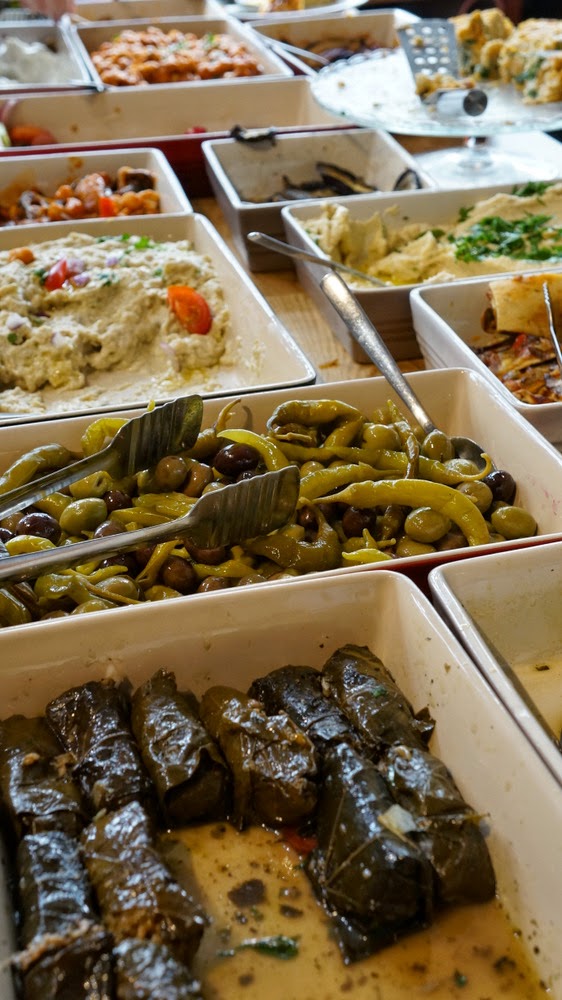 La formule brunch coûte 22,50€ et comprend trois boissons: un thé vert à la menthe fraîche, une orange pressée et un café en fin de repas. Très correct par rapport à ce qui se pratique sur Bruxelles en ce moment. Le buffet se compose d’une partie froide dans laquelle il me semble voir exclusivement des plats végétariens, et d’une partie chaude avec entre autres un tajine d’agneau et des saucisses qui font le régal de Chouchou. Tout est délicieux, et je regrette vraiment de n’avoir pas assez d’appétit pour enchaîner après une première assiette froide. Je me contente d’une petite mousse au chocolat (que j’ai bien du mal à terminer), choisie parmi les gâteaux, fruits et entremets de la partie sucrée.