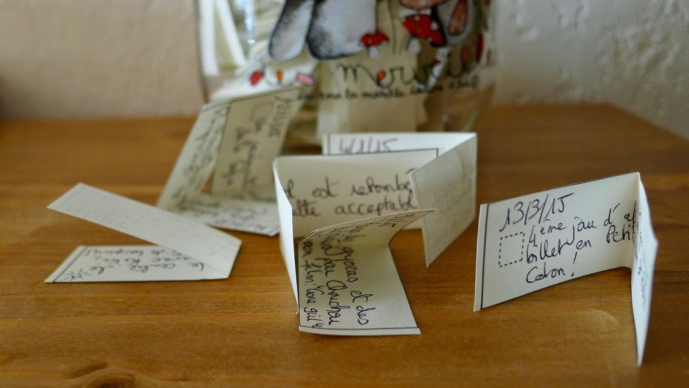 J'aime beaucoup le concept de l'happiness jar. Pour l'instant, j'en suis au petit carnet mais j'ai encore du mal à m'y tenir chaque jour.