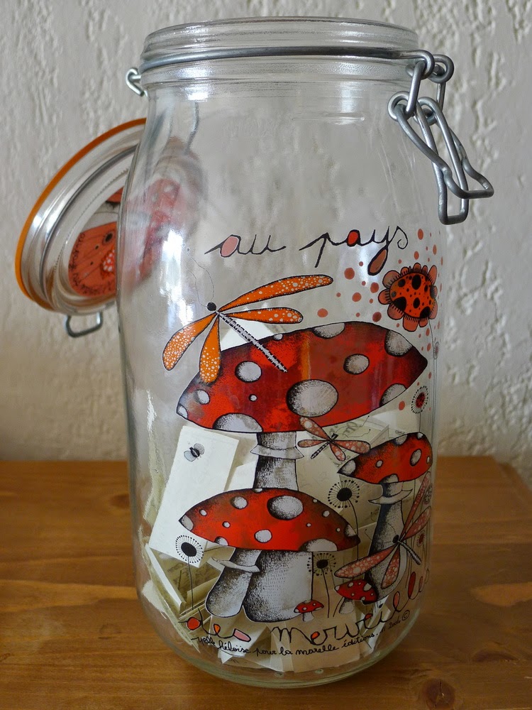 Bref, j’ai sauté sur cette excellente idée. J’ai commencé par stocker mes bouts de papier dans un vieux bocal de confiture Bonne Maman que j’avais conservé par sentimentalisme, parce que le couvercle portait encore une étiquette marquée « ABRICOT 12 juillet 2012 » de la belle écriture si nette de mon père. Mais très vite, il est devenu trop petit. Alors, j’ai apporté à ma couturière la collection de boutons fantaisie constituée il y a une dizaine d’années, et dont je ne faisais absolument rien, pour libérer un magnifique (et très grand!) bocal orné d’un motif signé Mlle Héloïse, acheté sur le regretté site des éditions La Marelle. Cette fois, je suis largement parée jusqu’au 31 décembre!