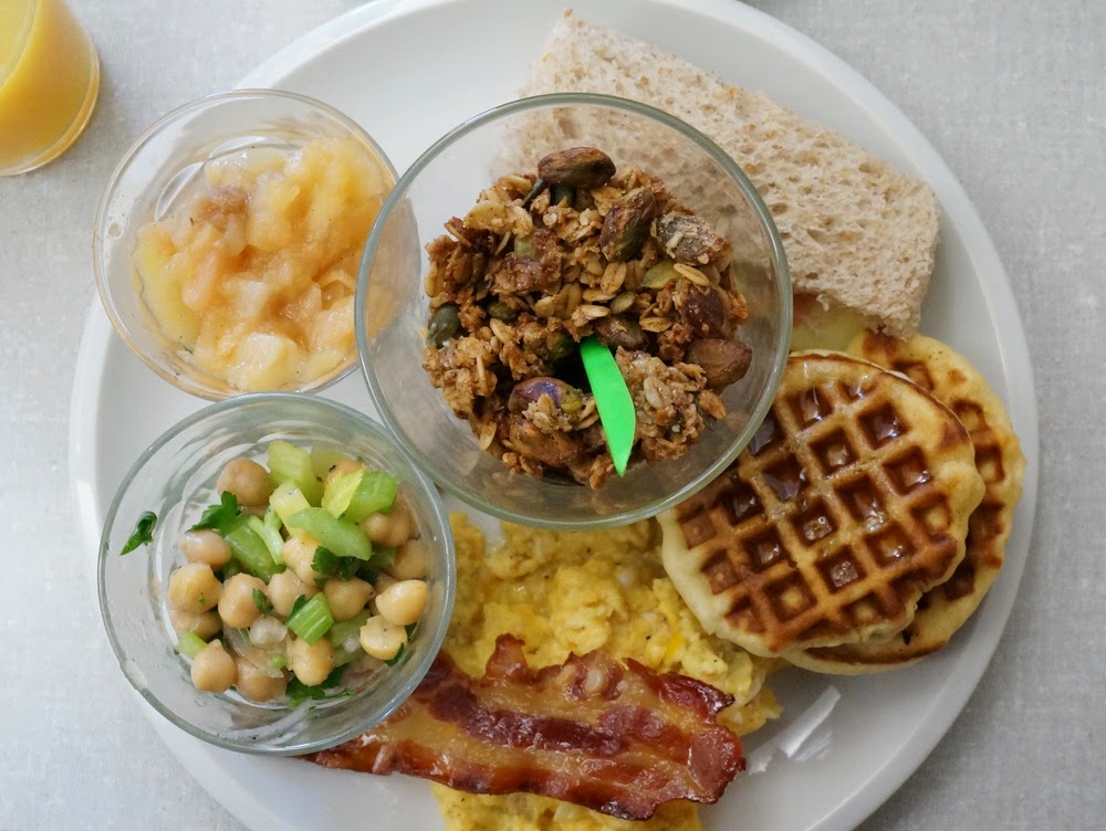 Néanmoins, je dois dire que j’ai adoré ce brunch. D’abord, par opposition aux buffets ruineux et qui incitent à trop manger, dont je déplore la généralisation depuis quelques années, il s’agit ici d’une formule à l’assiette avec des quantités bien calculées: sans avoir pris de petit-déjeuner, je n’ai pas tout à fait réussi à finir (mais Chouchou s’en est chargé à ma place!). Ensuite, la nourriture elle-même est franchement délicieuse: un granola fabuleux, des oeufs au bacon caramélisé, un mini-sandwich jambon-fromage, une salade qui change tous les dimanches (là, c’était pois chiche-céleri), trois divines mini-gaufres au sirop d’érable et une compote de pommes fabuleusement fondante. Enfin, le prix est le plus démocratique que j’ai vu depuis longtemps: 15€ boissons comprises. Et ils acceptent toutes les cartes de paiement.