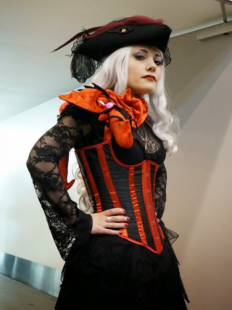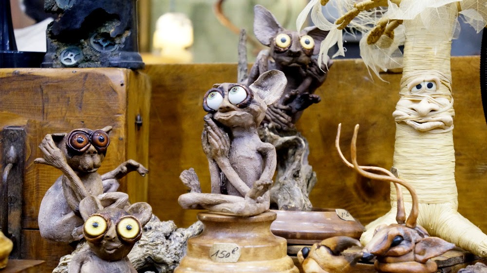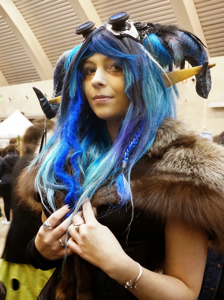 Nous avons ensuite pris quelques photos des visiteurs costumés et exploré le marché féérique (où j’ai croisé Laëtitia, une lectrice du blog déjà rencontrée là en 2013). Bon point: les allées avaient été élargies, et on circulait beaucoup mieux entre les stands. La contrepartie, c’est qu’un grand nombre de ces derniers avaient été dressés à l’extérieur, alors que la météo ne donnait pas du tout envie de traîner dehors. Nous n’avons donc fait qu’un tour rapide. Trois des exposants m’ont marquée par l’originalité de leurs produits: