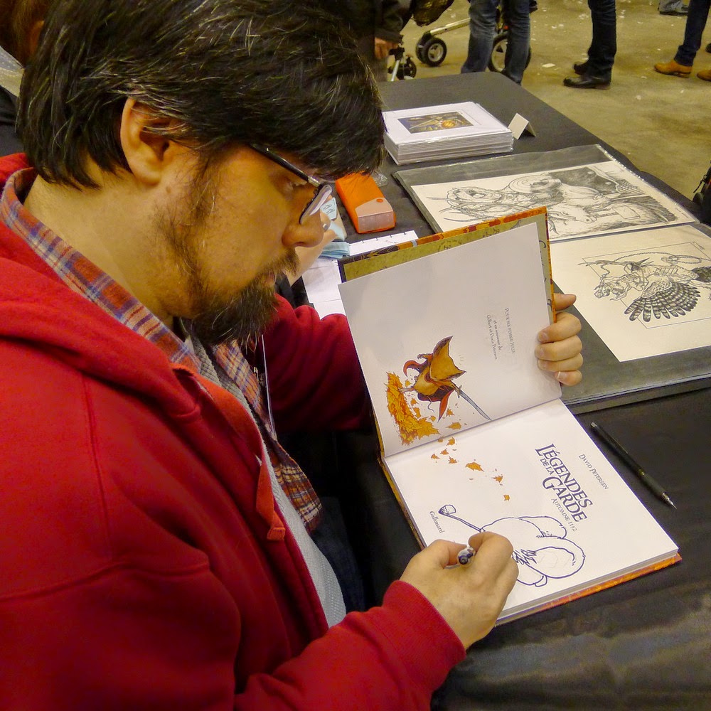 Le début de l’après-midi s’est mieux présenté. Grâce aux gentils bénévoles de l’organisation, j’ai pu pénétrer sur le stand de la librairie bédé pour échanger quelques mots avec David Petersen, aussi adorable que talentueux. Cela dit, comme il était en dédicace, je ne me suis guère attardée: ç’eût été manquer de respect envers les gens qui attendaient devant sa table depuis je ne sais combien de temps. L’essentiel, c’est que j’ai pu me présenter et obtenir de lui une adresse mail où envoyer mes futures questions (manque de chance, j’avais rendu la traduction du tome 4 des « Légendes de la Garde » le mercredi d’avant!). J’ai aussi fait signer un de mes exemplaires du tome 3, histoire de garder un petit souvenir. Je suis ensuite passée sur le stand librairie romans, où j’ai salué Trudi Canavan rapidement pour les mêmes raisons. J’aurais vraiment aimé passer un peu de temps à bavarder avec elle, mais les circonstances ne s’y prêtaient pas. Tant pis! Mon objectif de la journée était atteint.
