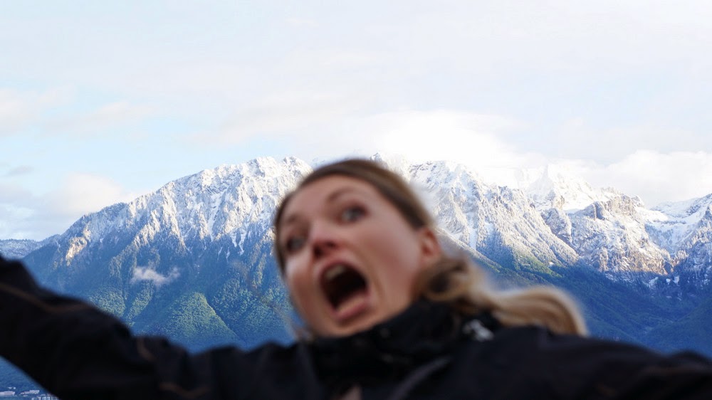 Même à demi planquées par le brouillard, les montagnes sont magnifiques. Marika championne de photobombing (elle a tout appris à Benedict Cumberbatch). Elle me prête son bracelet connecté pour que je puisse tester, en m’ordonnant de marcher au moins vingt minutes le soir pour ne pas pourrir sa moyenne. Résultat, une fois rentrée chez Lady Pops, je fais les cent pas dans le salon. Histoire de faire semblant d’avoir une alimentation équilibrée, la maîtresse de maison nous prépare une soupe fabuleuse: une chaudrée au poulet, chorizo, épinards et crème de maïs, recette de la blogueuse Trois fois par jour. Chouchou en engloutit 3 assiettes, tandis que je me restreins à 2 – malgré quoi je n’ai plus beaucoup de place pour la tarte aux pommes préparée avec amour par Miss A. Compteur calorique de la journée: moins pire qu’hier, mais clairement, la malnutrition ne nous guette pas.