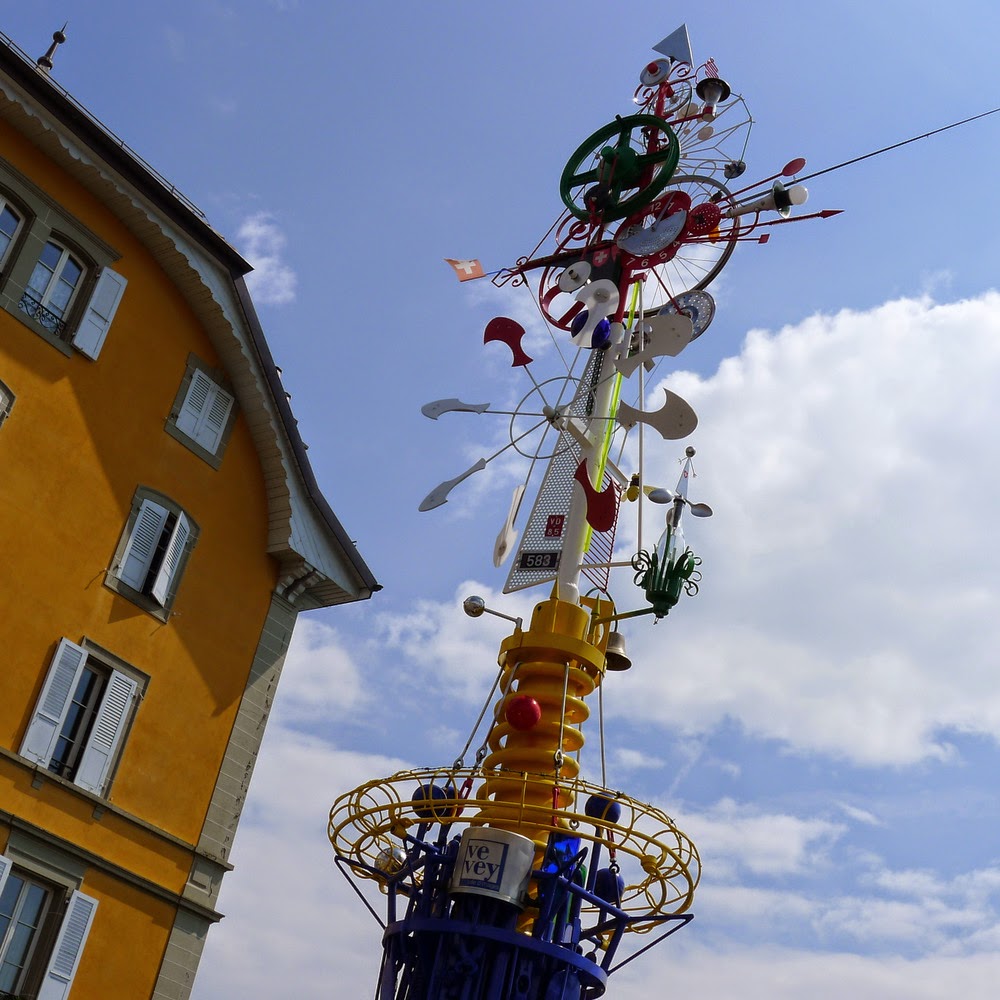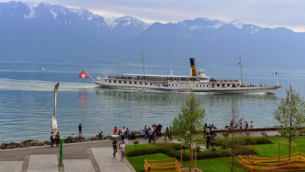 Cette sculpture géniale qui allie science et poésie, entre le parking et le bord du lac à Vevey – est-ce que c’est possible de la piquer en douce pour la rapporter à la maison? Marika nous rejoint en robe bain de soleil et tongs; je porte une jupe d’hiver, des collants et des boots de moto: on dirait qu’on n’appartient pas au même espace-temps. Le timing est serré; modifions nos plans et commençons par faire les courses. Claquer 100€ en fromage (plus 5 tablettes de chocolat), c’est une expérience inédite pour moi. Euh, Chouchou, tu as vu le prix du livre que tu guignes chez Payot? Il coûte 12€ de plus qu’en France; achète plutôt l’e-book sur Amazon!