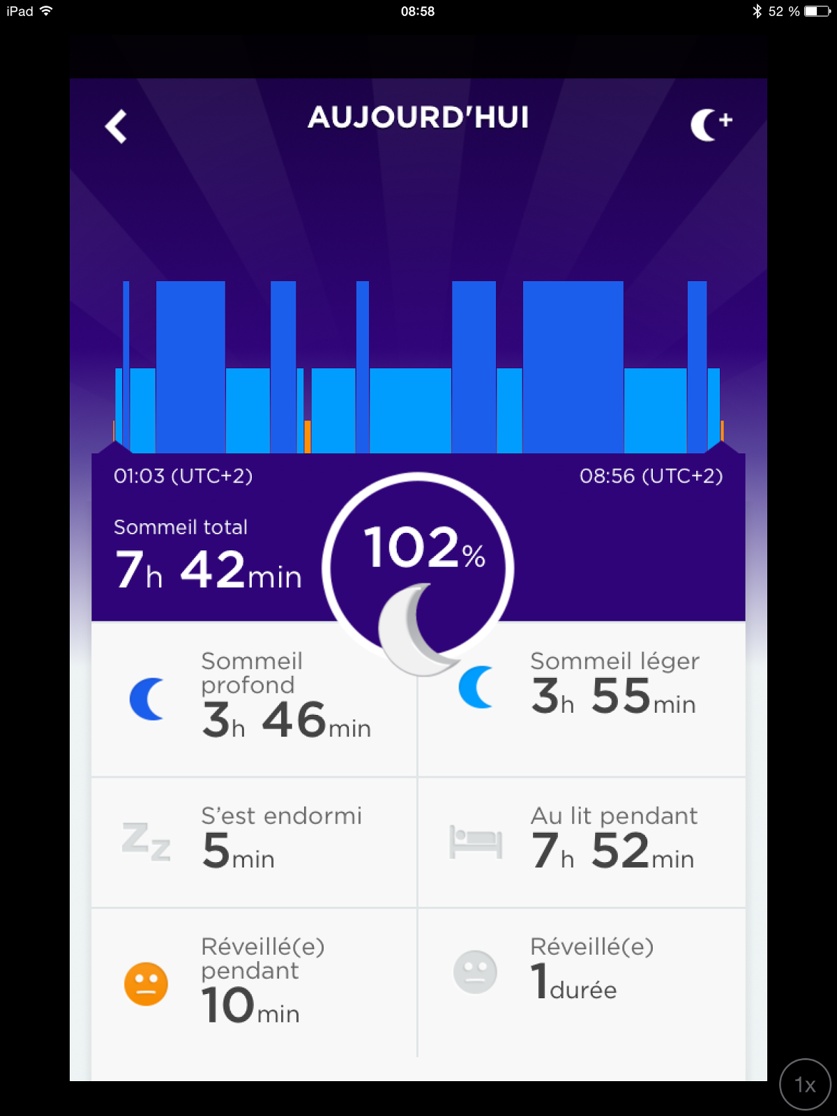 Je n’étais pas particulièrement intéressée par cette fonction: après avoir été insomniaque une grande partie de ma vie, je jouis désormais d’un bon sommeil pour peu que personne ne ronfle bruyamment à côté de moi et qu’aucun bébé ne hurle à la mort dans l’appartement voisin. Néanmoins, la curiosité m’a poussée à définir quand même un objectif de 7h30 par nuit et à regarder de quelle façon mon sommeil se décomposait: temps d’endormissement, proportion de sommeil léger et de sommeil profond, réveils durant la nuit… Ca reste très instructif.