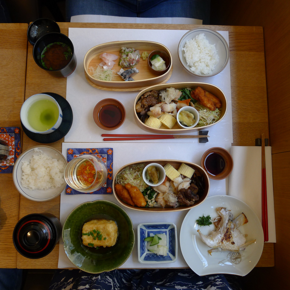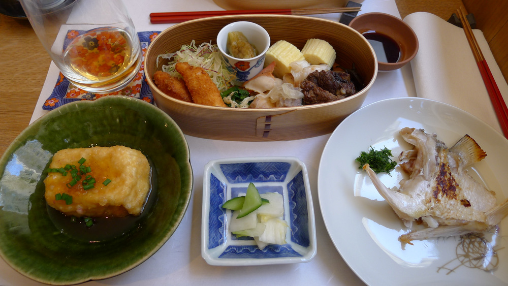 La nourriture était tout à fait à la hauteur des descriptions de Mélusine. Je ne suis pas certaine d’avoir identifié tout ce que j’ai mangé, je sais juste que 1/le tofu grillé, ce n’est pas facile à couper avec des baguettes à cause de la « peau » qui résiste 2/dépiauter une joue de poisson avec des baguettes, ce n’est pas évident non plus 3/tout était fabuleusement bon, y compris le riz et la soupe miso, les deux accompagnements les plus humbles de ce bento de luxe (qui était précédé d’une entrée non photographiée).