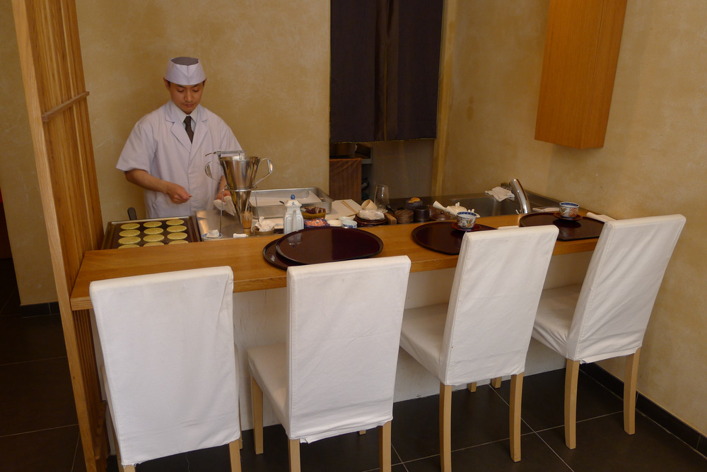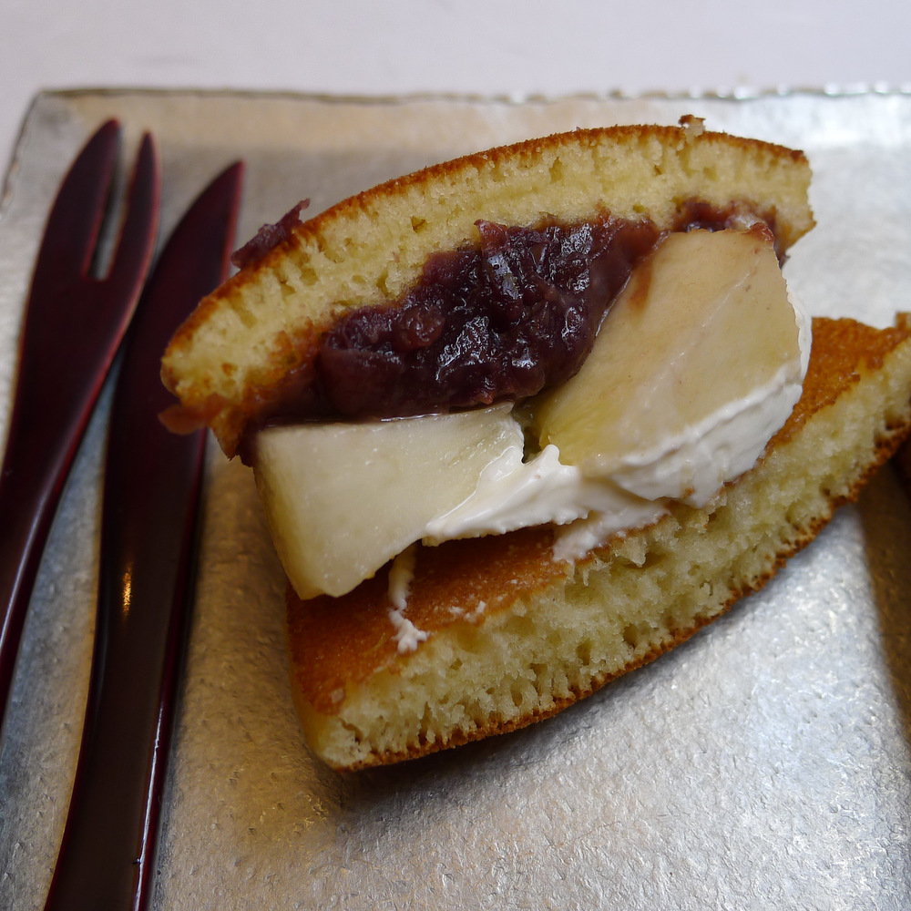 Mais le meilleur, je crois, c’était le dessert (servi avec un thé compris dans le menu, et suivi d’une sorte de pousse-dessert non-photographié). Je ne suis pas fan de pâtisseries japonaises; pourtant, j’ai complètement craqué sur le doryaki à la pêche blanche, sorte de sandwich de pancakes avec de la pâte de haricot rouge et une crème fouettée ressemblant un peu à du mascarpone. Sucré mais pas trop, subtil et délicat, c’était un vrai ravissement des papilles. Hélie en a commandé un à emporter, avec un autre gâteau en forme de fleur rose que le chef a confectionné sous nos yeux éblouis à l’aide d’un tamis et de gestes cabalistiques. (Ses pâtisseries sont présentes sur le stand du Japon à l’Exposition Universelle de Milan – c’est dire si elles sont formidables!)