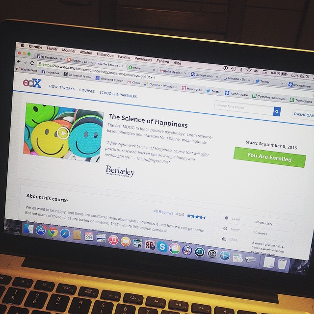 Longtemps après être entrée dans la vie active, j’ai continué à étudier en cours du soir ou par correspondance, juste pour le plaisir. Si j’avais pu me le permettre, je serais restée étudiante à jamais. Puis je suis devenue paresseuse pragmatique. Mais aujourd’hui, grâce aux MOOC, on peut étudier toutes les matières possibles et imaginables gratuitement, avec les meilleurs professeurs du monde, chez soi et à son rythme. J’ai longtemps repoussé le moment de m’y mettre; ce défi est l’occasion rêvée de m’inscrire. J’ai repéré deux cours de psychologie positive, un de 8 semaines à 4-5 heures de travail hebdomadaire annoncé, l’autre de 6 semaines à 2-4 heures de travail. Mais seul le premier est disponible pour le moment – même s’il ne commence réellement que le 8 septembre. Me voilà donc inscrite au MOOC « The science of happiness » de l’université de Berkeley. Et en train de de passer en revue la liste des autres cours sur lesquels je pourrais me faire les dents pendant l’été – je suis assez tentée par ceux qui traitent de développement durable.