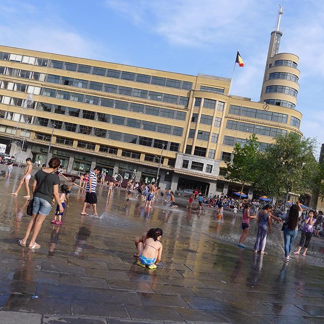 Sur la place Flagey où je regarde les enfants en maillot de bain s’éclabousser sous les jets d’eau en regrettant de ne pas pouvoir me joindre à eux.