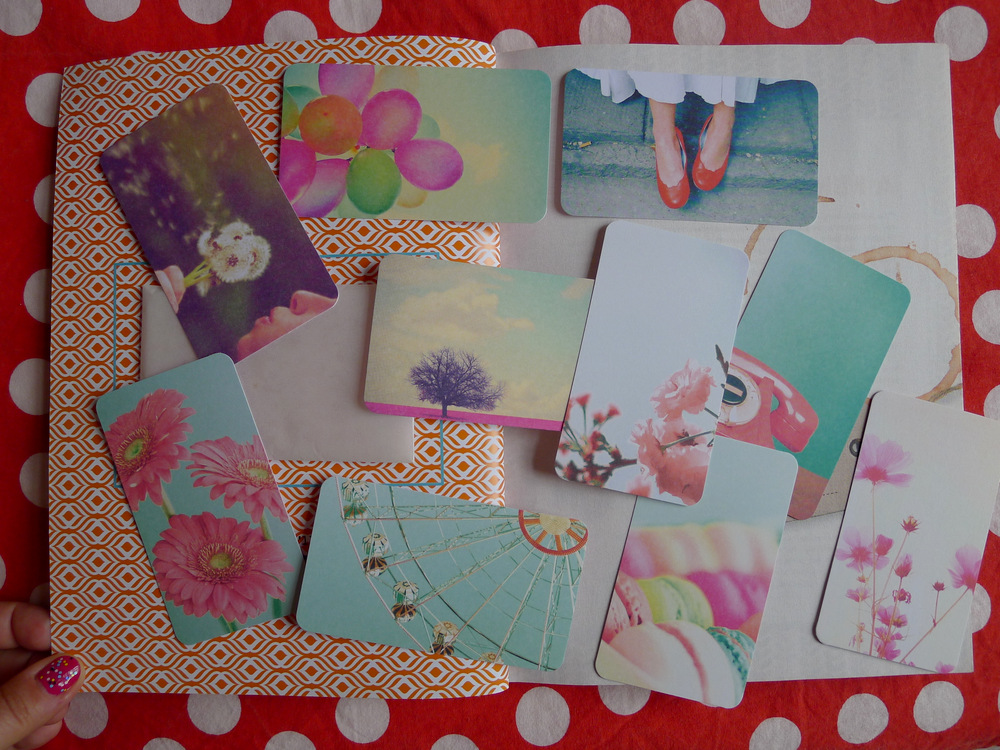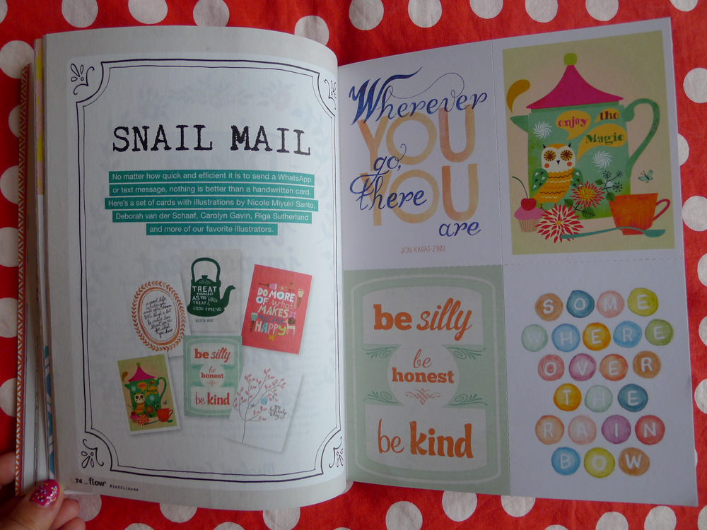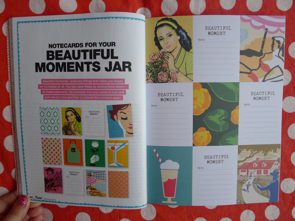 – Comme d’habitude, des tas de goodies papier aux illustrations ravissantes: cartes au dos desquelles écrire des remarques, cartes à ranger annotées dans un bocal de beaux moments, cartes postales à envoyer, mini-journal « une pensée par jour », mini-journal « une chose à la fois »