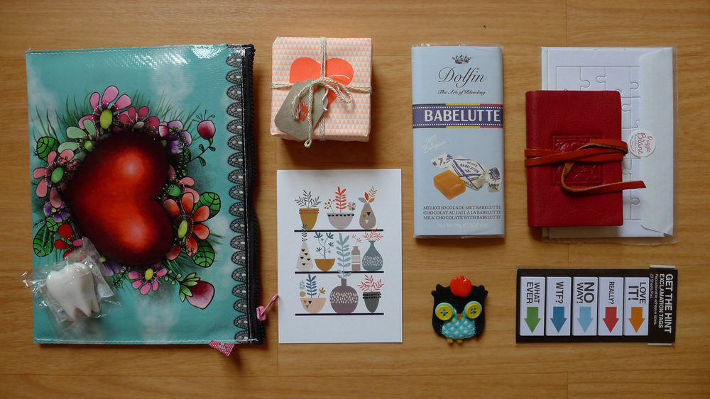 Très sympa, mais ça ne me disait pas grand-chose sur ses goûts. Alors, je lui ai envoyé un mail pour faire plus ample connaissance. Et je n’ai pas reçu de réponse. Du coup, la date limite d’envoi approchant, j’ai composé mon colis un peu au hasard. J’y ai mis une jolie trousse La Marelle, un carnet rouge à la couverture en cuir ouvragé, une plaquette de chocolat Dolfin au babelutte (un bonbon belge), une broche hibou en feutrine et en tissu, une carte-puzzle sur laquelle dessiner soi-même, des Post-it marrants en anglais, un savon fantaisie, et une jolie carte derrière laquelle j’expliquais mes choix (la gomme dent présente sur la première photo ne rentrait pas dans mon enveloppe à bulles; elle a donc été remplacée au dernier moment par un sachet de tisane au bambou). J’ai tout emballé soigneusement et expédié à l’adresse fournie, puis signalé mon envoi sur le site comme prévu. Et j’ai attendu que ma swapée accuse réception, au moins par le même moyen.