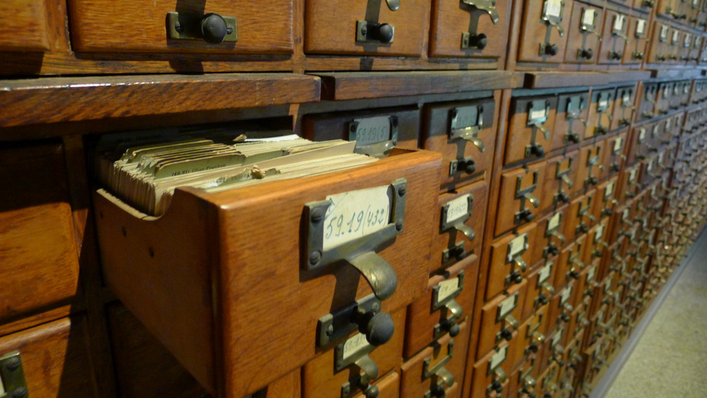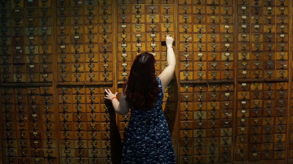 Mais les murs sont toujours recouverts des fabuleux meubles d’archives dont les tiroirs contiennent des fiches censées répertorier tout le savoir disponible à l’époque où elles ont été tapées à la machine à écrire. Un trésor de papier qui a fait palpiter mon petit coeur d’extase.