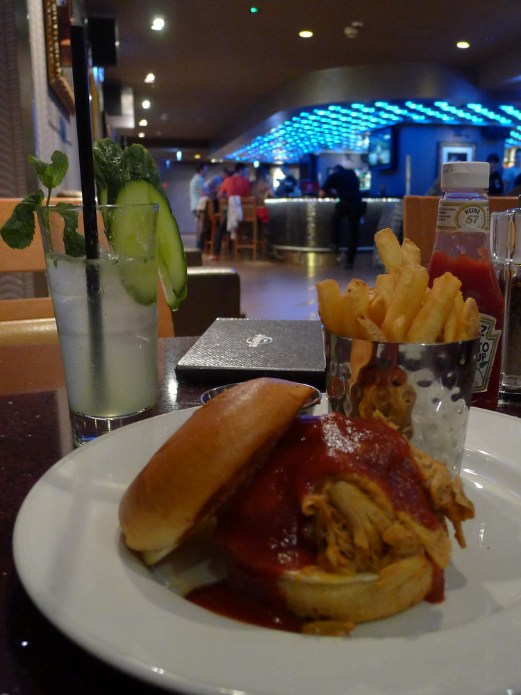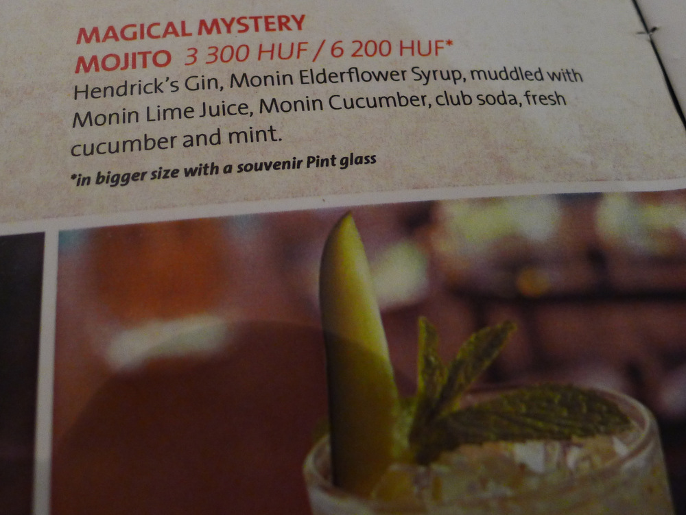 Le Hard Rock Café de Budapest se trouve en sous-sol. Ce n’est pas la plus belle salle que j’ai vue dans cette chaîne, mais pas la plus moche non plus, et la musique qu’ils passent ce soir est vraiment excellente. Je commande un Magical Mystery Mojito à base de… gin, à ma grande surprise. Mais je le trouve très bon, et le premier cocktail des vacances, ça fait forcément du bien. Je pensais prendre le burger végétarien ou la Cobb salad; en fin de compte, je me laisse tenter par un savoureux Hickory chicken burger. Nous passons un moment agréable, un peu gâché toutefois par l’arrivée de l’addition. Presque 50€ (10% de service inclus) pour un cocktail, un tonic, deux burgers et une glace vanille, à Budapest, c’est carrément outrancier. C’est le problème du Hard Rock Café: les prix sont plus ou moins les mêmes partout dans le monde, et dans les pays à monnaie faible, ça revient deux ou trois fois plus cher de manger là que dans un établissement local qui sert le même genre de plats. Un peu agacée, je renonce à faire l’emplette du T-shirt Imagine Dragons repéré dans la boutique en arrivant. De toute façon, c’est un modèle pour hommes, parce que leurs modèles pour femmes sont généralement roses et/ou plein de paillettes. Grmbl.