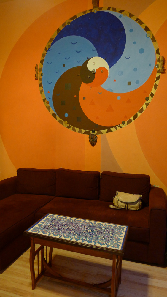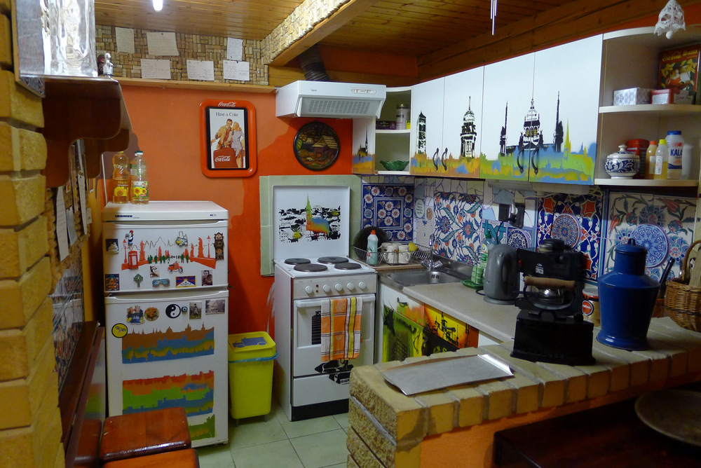 Le métro est une vraie antiquité, j’ai l’impression d’avoir remonté le temps jusque dans les années 50. Nous en sortons à Nyugati Palyaudvar et, de là, marchons une petite dizaine de minutes jusqu’à l’appartement que nous avons loué sur Airbnb. La propriétaire nous attend et nous fait visiter les lieux. Pas de mauvaise surprise par rapport aux photos vues sur le site; c’est même un peu plus grand que je ne l’imaginais, et la déco est franchement délirante. J’adore celle de la cuisine et trouve celle de la salle de bain un poil cauchemardesque. Je n’aimerais pas habiter ici en permanence, mais pour une semaine, ce sera très fun!