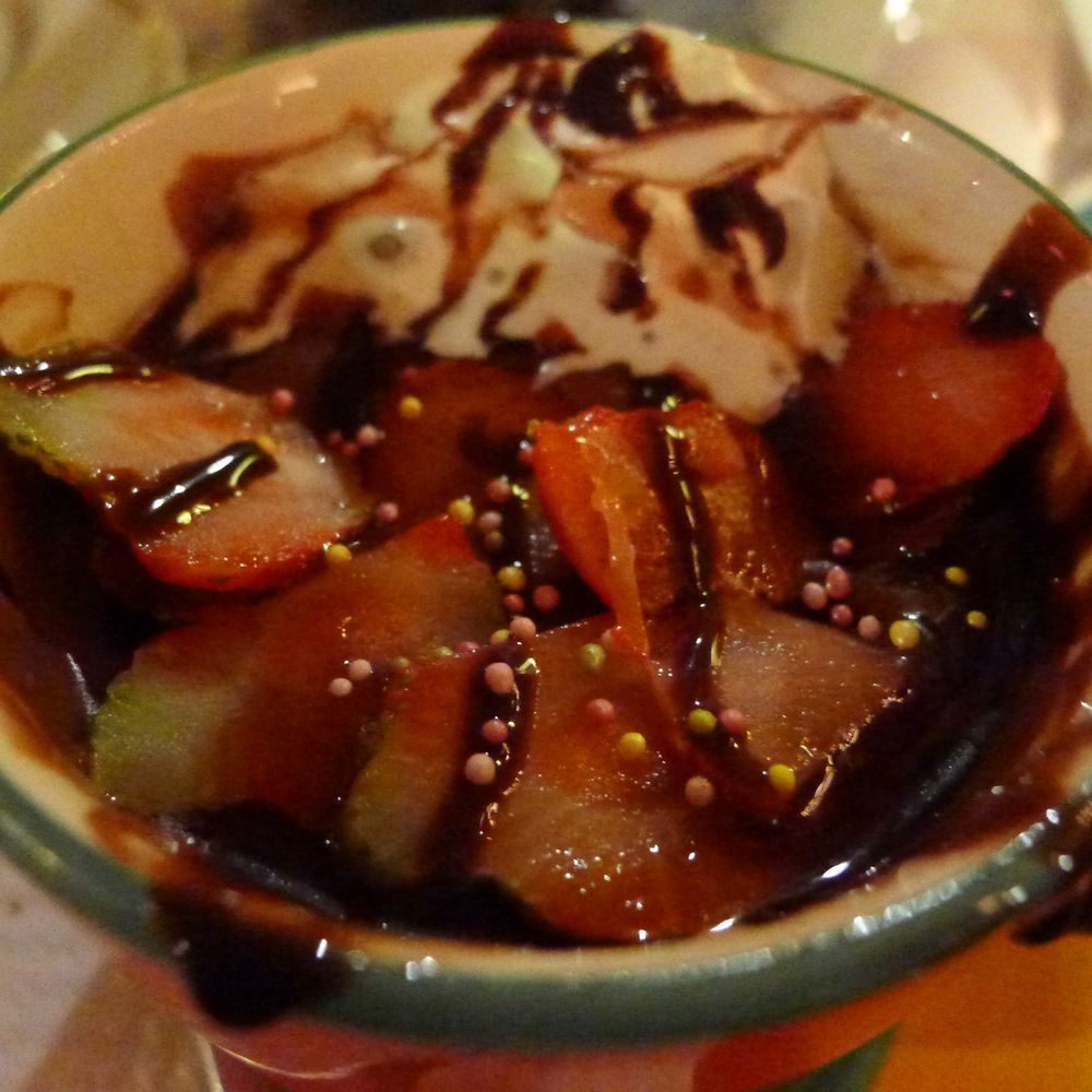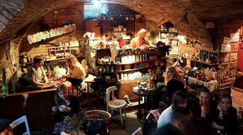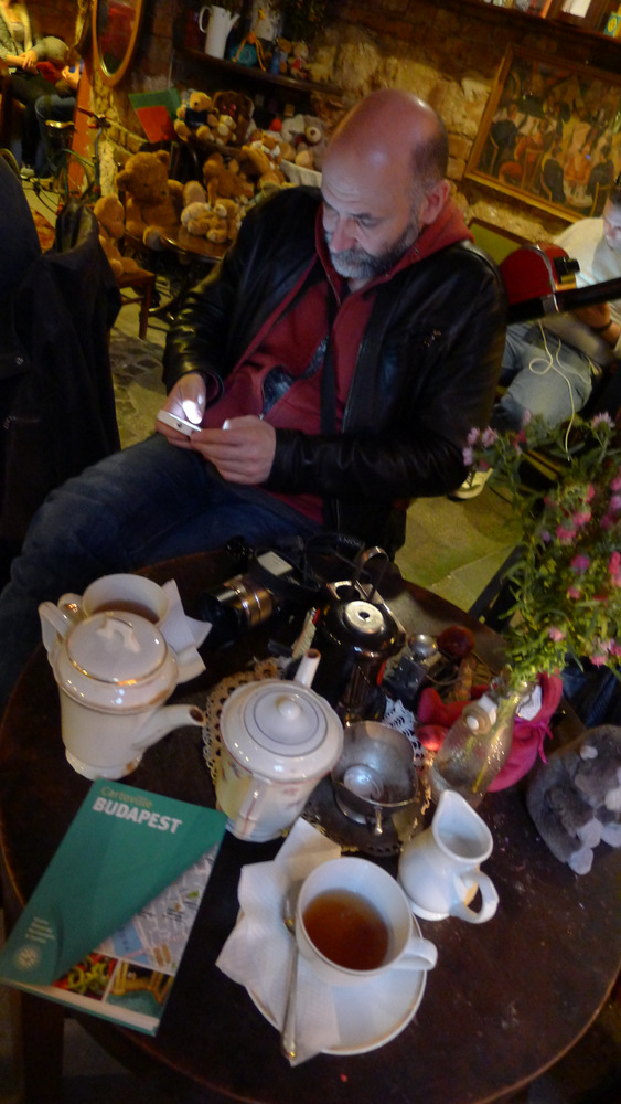 Nous allons nous calmer dans un salon de thé recommandé par la GM de Mind Crime hier: le Rengeteg Romcafé, assez loin de toute attraction touristique pour qu’on ne risque guère de tomber dessus par hasard. Je kiffe la décoration super chargée: vieux ours en peluche, bouquets de fleurs séchées, collection de bois flotté encadrée sur des murs rouge foncé. Je kiffe un peu moins l’absence de gâteaux et le fait que le thé soit du Clipper, une marque que je n’apprécie pas. Je sirote quand même un Earl Grey en admirant ce qui m’entoure quand mon regard se pose sur les fabuleux chocolats chauds aromatisés de la table voisine. J’en commande un à la fraise, avec du chocolat à 50% de cacao (on peut choisir la teneur, depuis 34% pour le chocolat au lait jusqu’à 80% pour le chocolat le plus noir). Il est si épais que je dois le manger à la cuillère au lieu de le boire, mais quel régal!