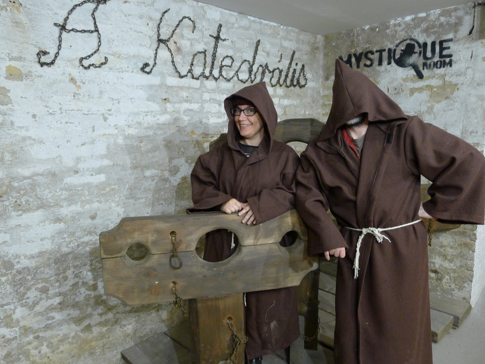 C’est donc la gueule légèrement enfarinée que nous nous pointons à la Mystique Room. Nous peinons d’ailleurs tellement à la trouver que nous nous demandons si nous n’allons pas être la première équipe qui n’aura même pas réussi à entrer dans le jeu! Finalement, nous sommes accueillis par la charmante Anna dans des locaux beaucoup plus grands et beaucoup mieux aménagés que ceux des escape games précédents. La salle Cathedral nous donne du fil à retordre, un peu parce que nous ne sommes pas au meilleur de nos capacités mentales en début de matinée, un peu parce que la lumière est très basse et notre vue de près plus très bonne: manipuler des cadenas aux chiffres minuscules dans ces conditions, c’est super galère. Je ne suis pas spécialement fan du thème: nous sommes des moines qui cherchent à retrouver les cinq morceaux épars du plan de leur cathédrale. Par contre, il y a quelques belles trouvailles techniques, notamment une épreuve musicale qui nous laisse perplexes et une autre de dextérité en équipe dont nous nous sortons plutôt bien. Nous réussissons à sortir à 2′ 22″ de la fin, avec un peu d’aide d’Anna. Par curiosité, je m’enquiers de leur autre salle à thème égyptien. « Elle est encore plus difficile. » Bien bien bien.