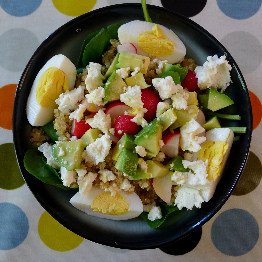 Samedi midi: nous rentrons juste du Delhaize et je n’ai pas envie de me casser la tête; je bricole donc une salade à base de pousses d’épinards, de quinoa, de radis ronds, d’avocat bien mûr, de feta et d’oeuf dur.