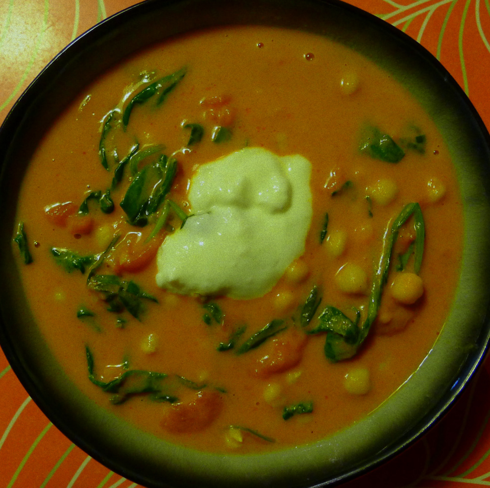 Samedi soir: je prépare mon curry de pois chiche vite fait; comme je n’ai pas de concombre sous la main, je me contente de poser du yaourt salé sur le dessus.