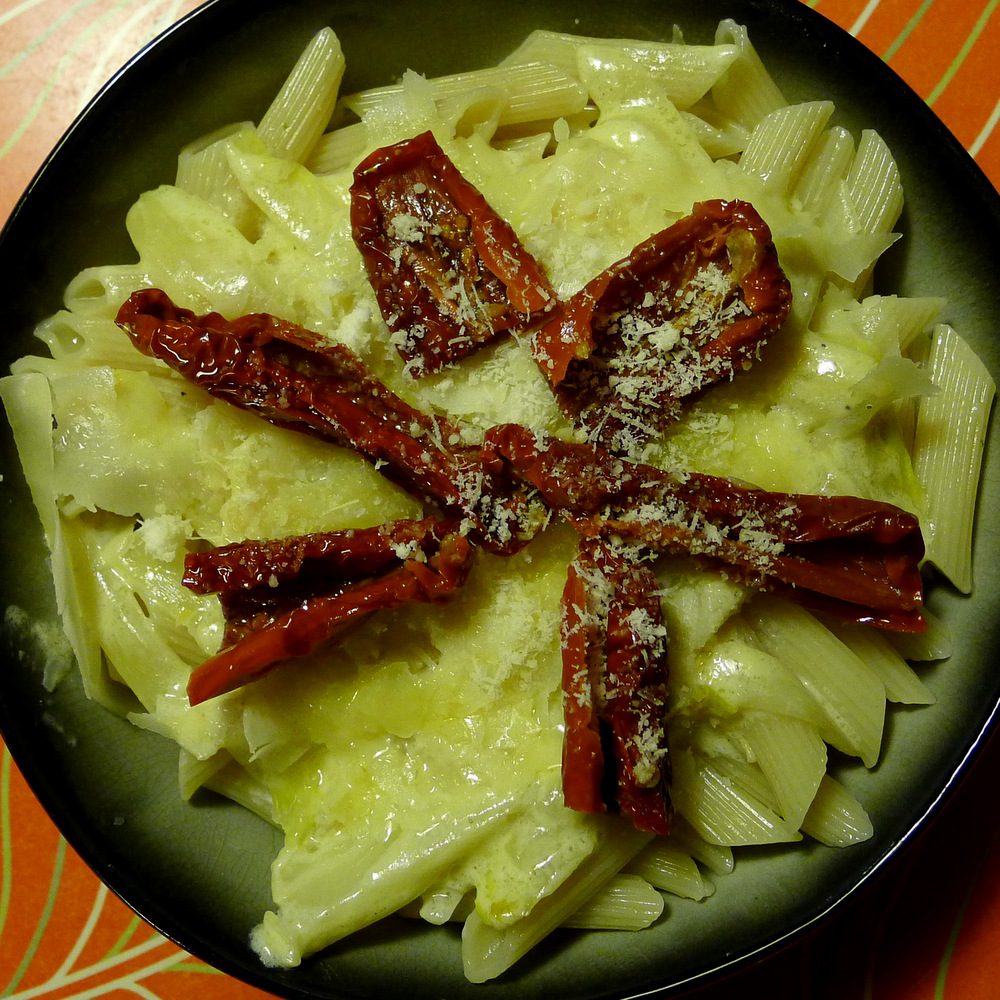 Dimanche soir: Chouchou nous fait ses célèbres pâtes aux chicons avec les tomates séchées qu’Annick m’a envoyées de Palerme, miam!