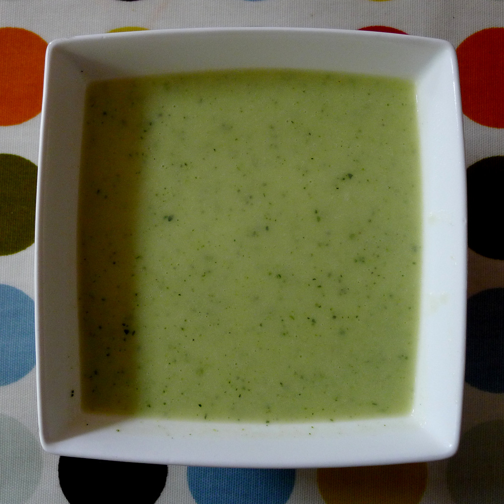 Lundi midi: il reste une portion des pâtes d’hier soir, que nous nous partageons; pour compléter, je prépare un velouté de courgette au Boursin.