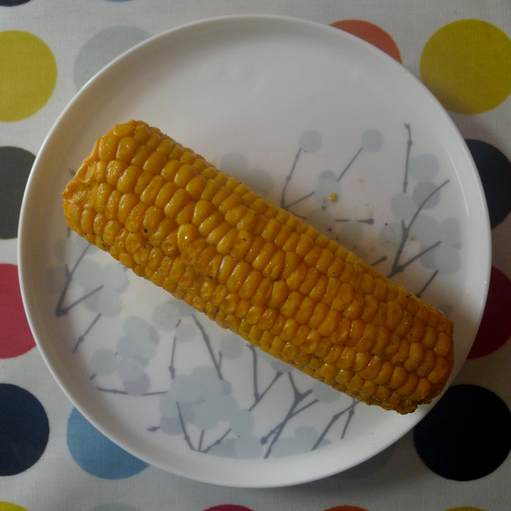 Mardi midi: nous finissons la tarte salée d’hier soir avec des épis de maïs grillés au four.