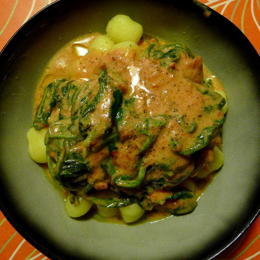 Mercredi soir: rapide et toujours délicieux, les gnocchi – avec une petite sauce tomate + épinards frais + crème légère.