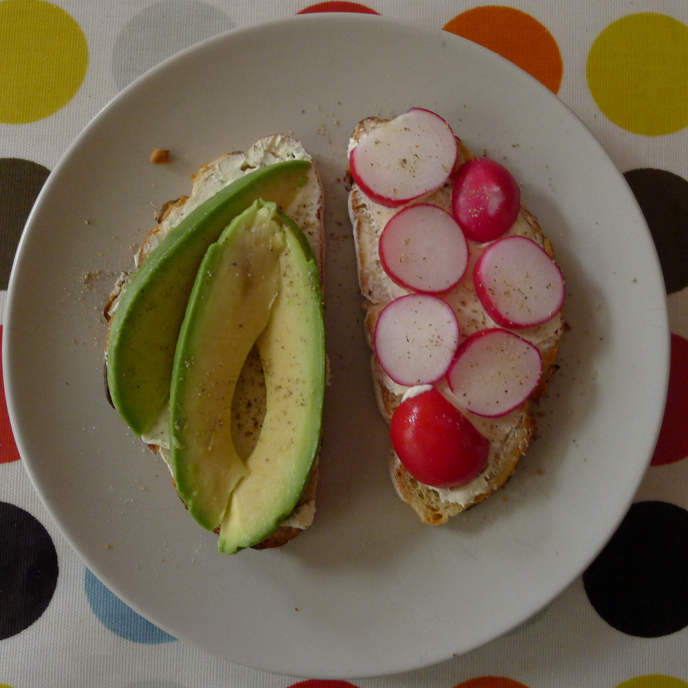 Jeudi midi: je réchauffe deux bols de velouté orange (j’en ai préparé une quantité industrielle; le reste ira au congélateur pour un soir de flemme) et bricole des tartines fromage frais + avocat ou radis.