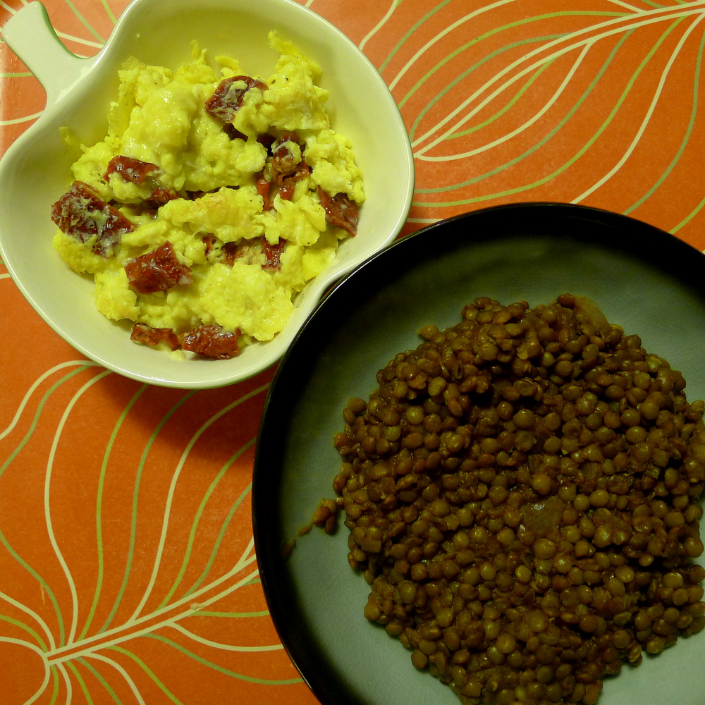 Jeudi soir: Chouchou nous régale de ses lentilles au mirin, un plat qui n’a l’air de rien mais auquel sa sauce donne un goût étonnant. Avec, il se fait un filet de dinde, et moi des oeufs brouillés à la tomate.