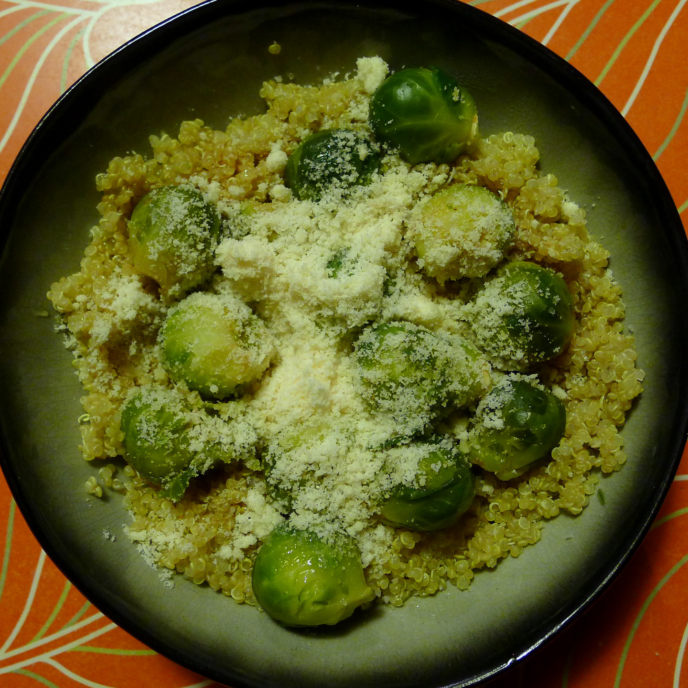 Vendredi soir: je prépare une salade tiède de quinoa aux choux de Bruxelles, avec plein de vinaigre balsamique. Normalement j’utilise des copeaux plutôt que du parmesan râpé, ça fait moins gloubi-boulga!