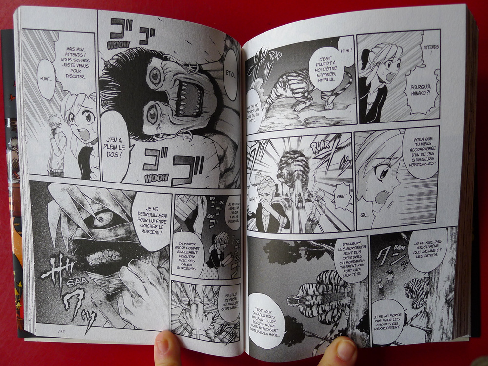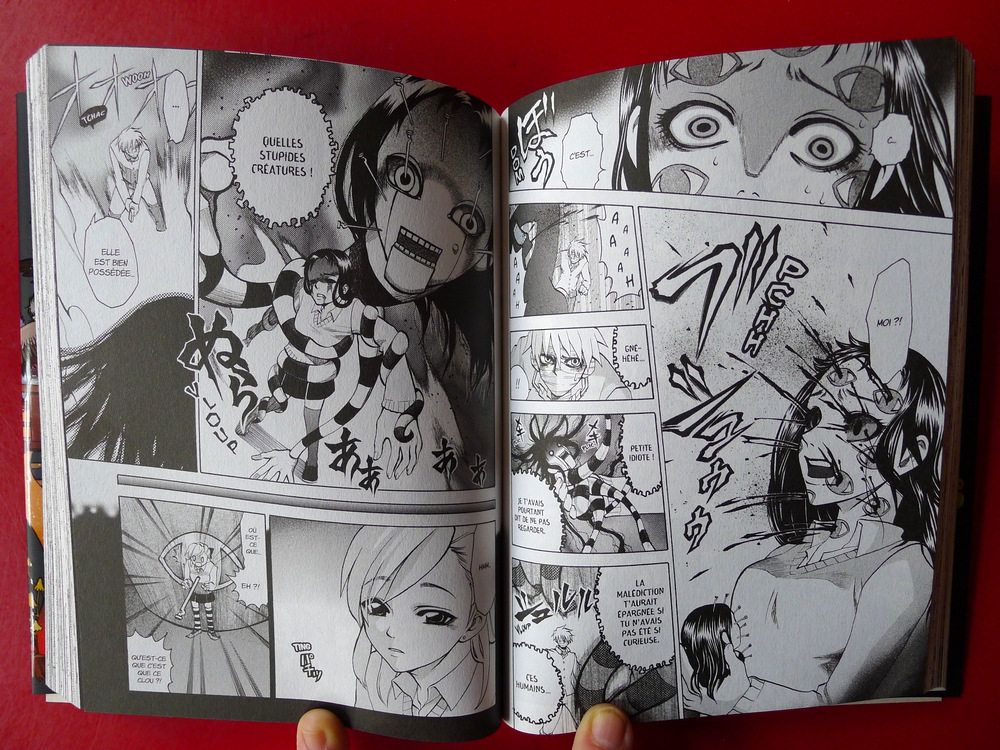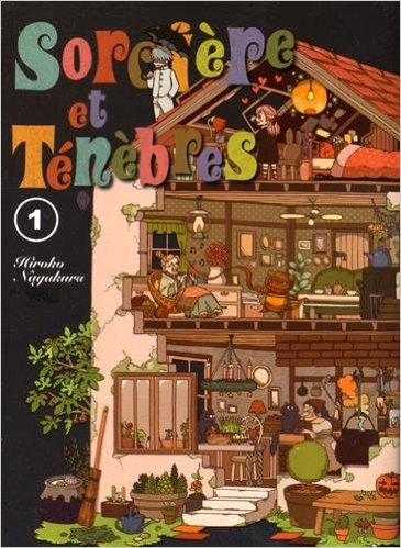 J’ai craqué pour la couverture de cet ouvrage, dont le style me faisait irrésistiblement penser aux films de Miyazaki. Hélas, elle s’est révélée plutôt trompeuse. Loin de l’atmosphère pleine de charme de « Kiki » ou du « Château ambulant », « Sorcière et ténèbres » mélange une magie noire au croisement du vaudou et du satanisme avec une romance d’une banalité à pleurer. L’héroïne mignonne, gentille et gaie qui soupire après un type mystérieux et désagréable, c’est tellement vu et revu… Le contraste entre sa naïveté typique du shôjo et la noirceur de batailles magiques dont l’ambiance rappelle plutôt « Death Notes » ne fonctionne pas du tout. De plus, sans être horribles, les dessins intérieurs sont d’une qualité assez médiocre – à part pour le très bel encart couleur de la fin. Bref, je n’ai vraiment pas apprécié « Sorcière et ténèbres« .
