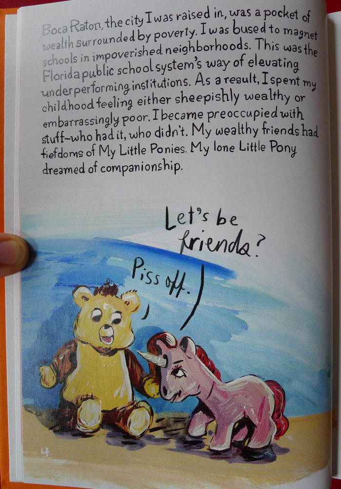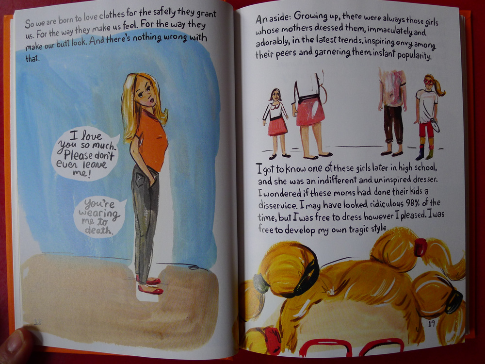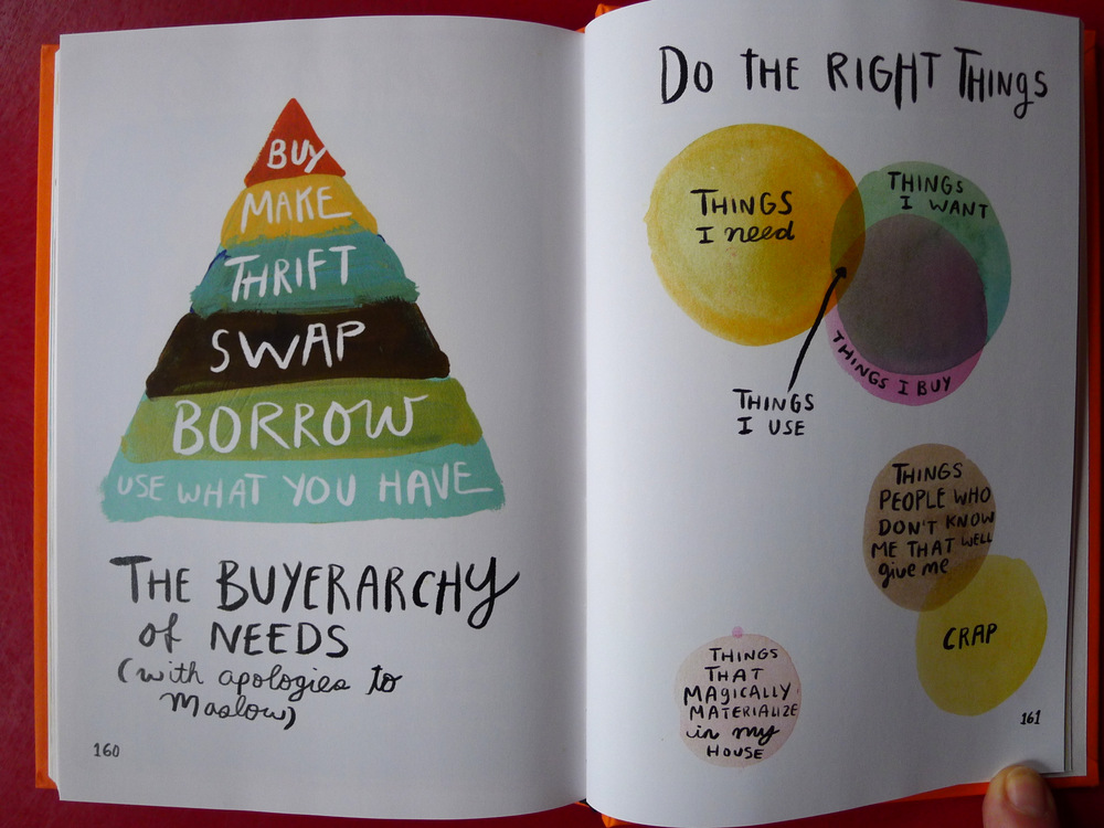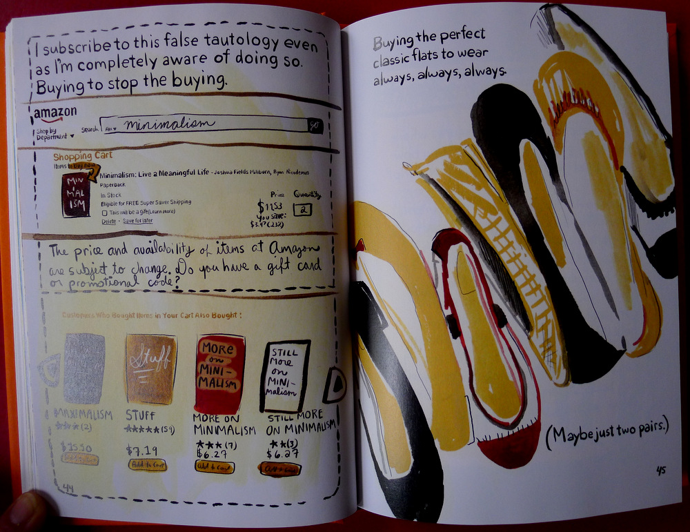 Dans ce mémoire illustré, l’artiste Sarah Lazarovic décortique son parcours de consommatrice depuis l’enfance: la recherche de son style, adolescente, et la façon dont ses choix vestimentaires participent à la construction de son image d’elle-même; le départ de chez ses parents et la nécessité d’établir un budget; sa boulimie de shopping et ses regrets consécutifs; sa découverte du minimalisme et, par la suite, la culpabilité associée à la moindre dépense; l’établissement de critères et la liste des achats auxquels cela l’a amenée à renoncer; enfin, une forme d’apaisement vis-à-vis de la consommation. J’ai aimé ses interrogations très proches des miennes, sa façon ludique de les présenter et le ton qu’elle emploie – celui de la confidence plutôt que d’une leçon donnée au lecteur.