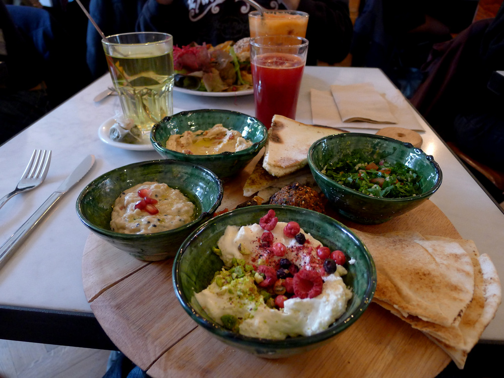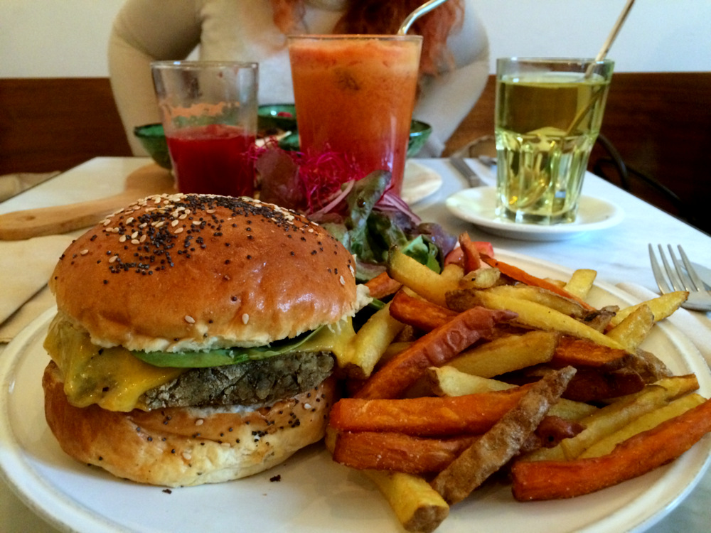 Nous savions par le site de Chyl que le restaurant proposait des options végétariennes, véganes, sans gluten et/ou sans lactose pour les clients intolérants. Que les carnivores se rassurent: trois des quatre formules brunch contiennent soit du jambon (pour la française), soit du saumon (pour la nordique), soit des saucisses et du bacon (pour l’anglaise). J’ai choisi la seule formule végétarienne: l’orientale, composée d’houmous, de caviar d’aubergines, de taboulé, de falafel, de feta, de pita et de crème fouettée surmontée de baies et de graines. Comme toutes les autres formules, elle est servie avec un thé ou un café au choix, plus un jus d’orange frais – sanguine ce jour-là -, le tout pour 20€. Quant à Chouchou, il a préféré tenter le burger végétarien accompagné d’un jus vitalité.