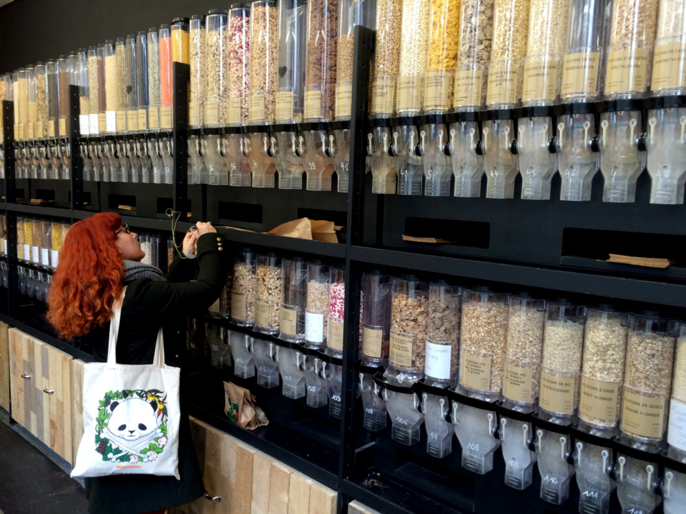 Après avoir réglé (en Visa, car les cartes de paiement sont acceptées sans problème), nous avons fait un tour à l’épicerie adjacente. Les prix sont similaires à ceux des autres points de vente bio que nous fréquentons; en revanche, nous avons été ravis de trouver une grande variété de produits en vrac – fruits secs et céréales. On prend un sachet en papier, on se sert soi-même, on inscrit le numéro du produit sur le sac et on emporte à la caisse. Nous avons fait une provision de lentilles noires et de lentilles jaunes, et craqué pour du riz soufflé aux baies rouges (oui bon d’accord, ça c’est juste moi parce que les grains sont ROSES et que ça fera joli sur Instagram).