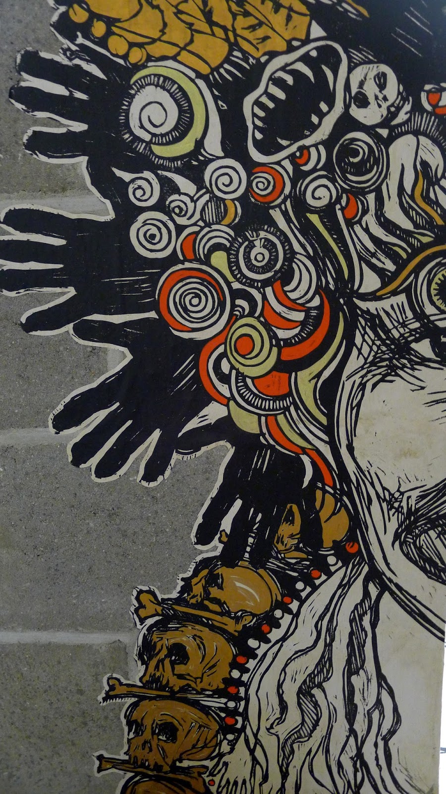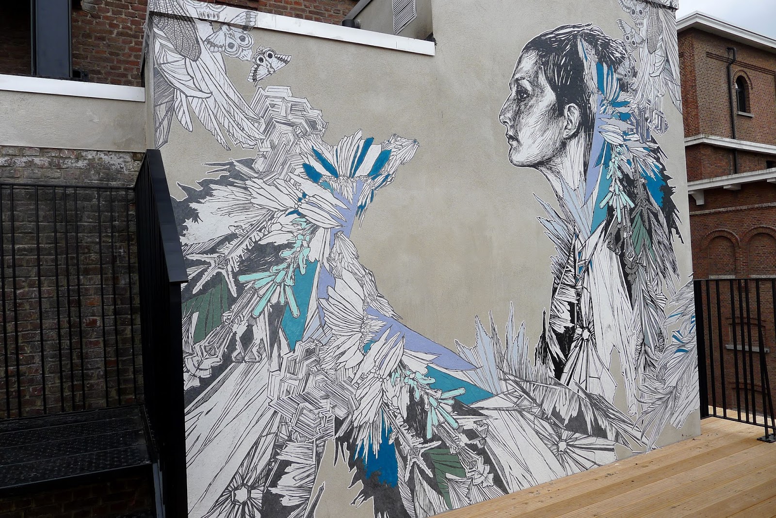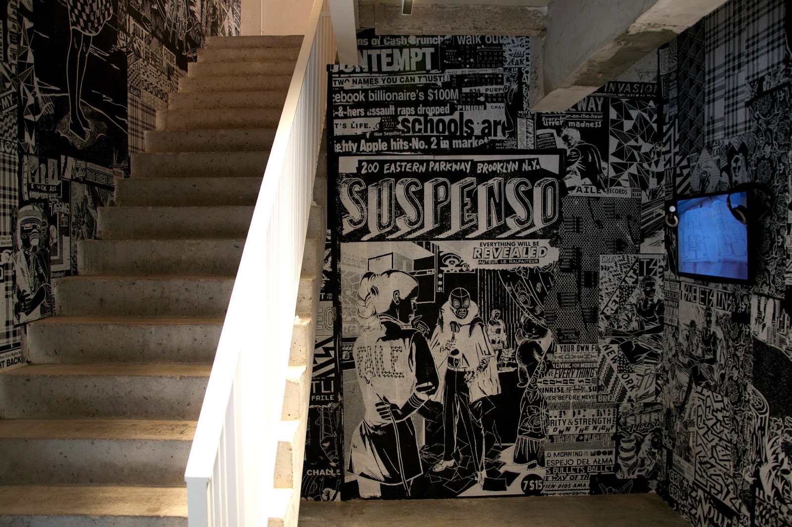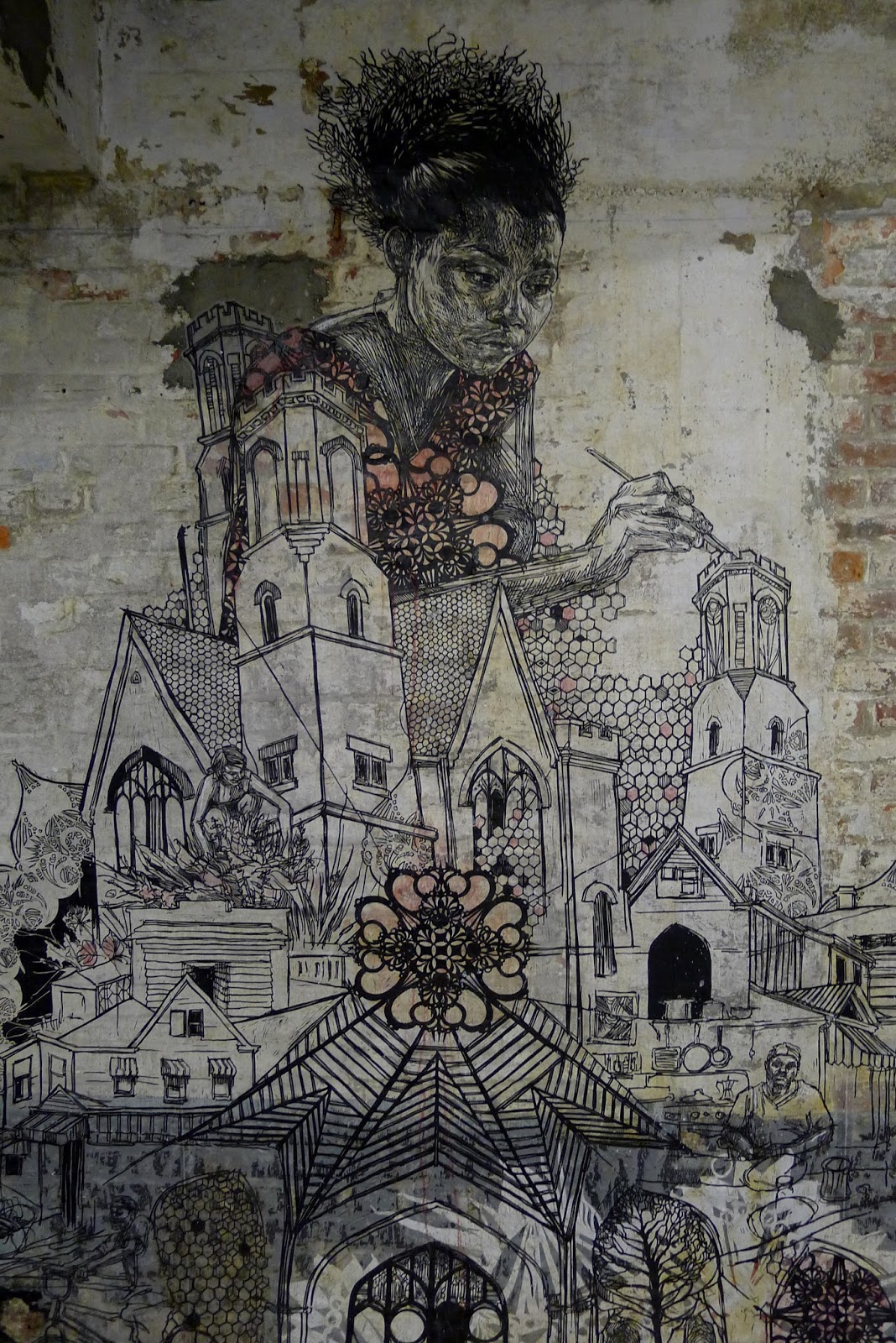 Passée l’entrée dans laquelle se trouvent une minuscule boutique et un resto-bar très agréable qui sert paraît-il de fabuleuses pizzas, nous avons commencé par descendre au sous-sol bien destroy où sont actuellement exposés les collages en papier de la street artist Swoon. L’adéquation entre lieu et oeuvres est absolument parfaite, et j’ai aimé traquer les motifs jusque dans les coins les plus reculés.