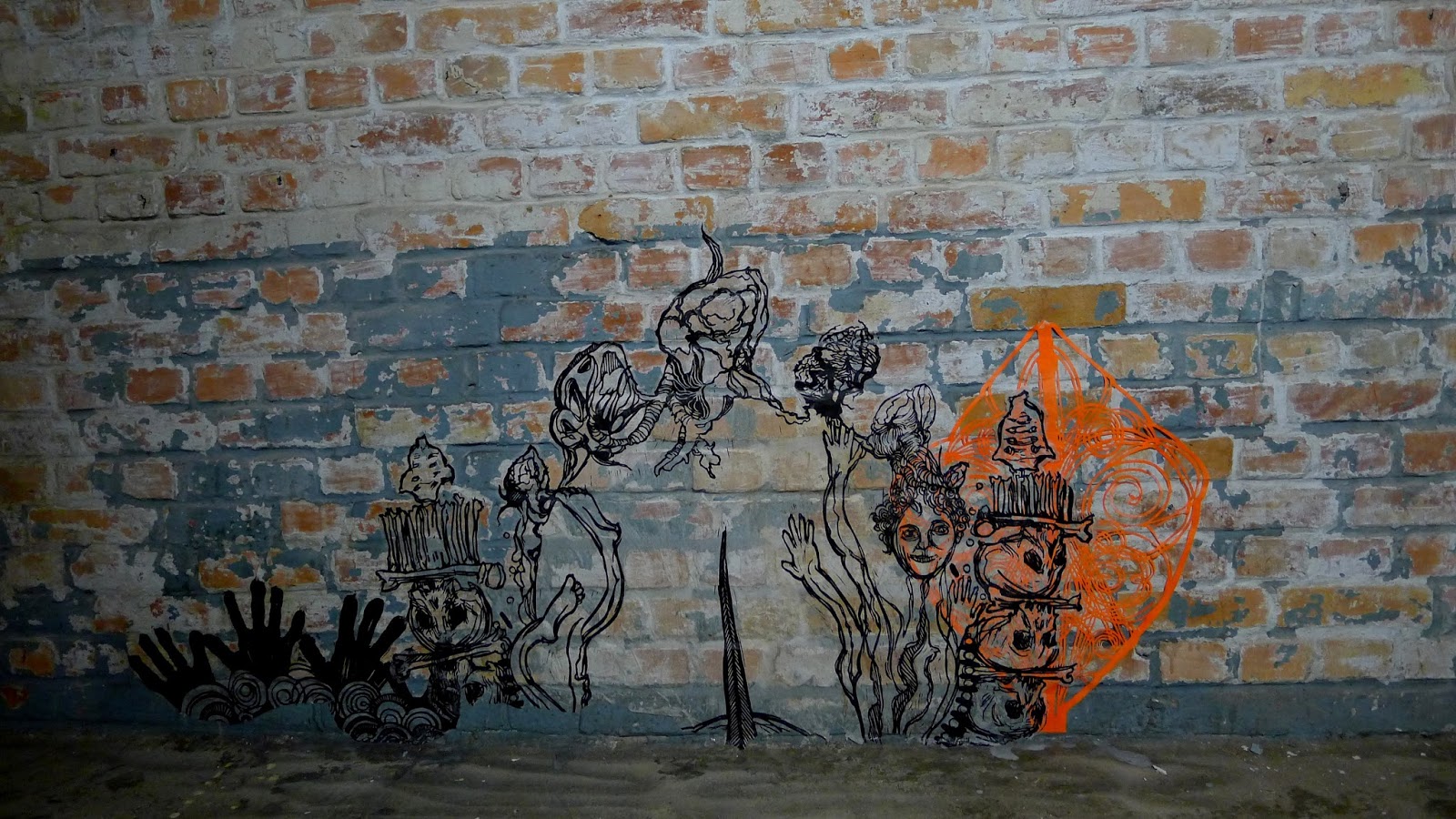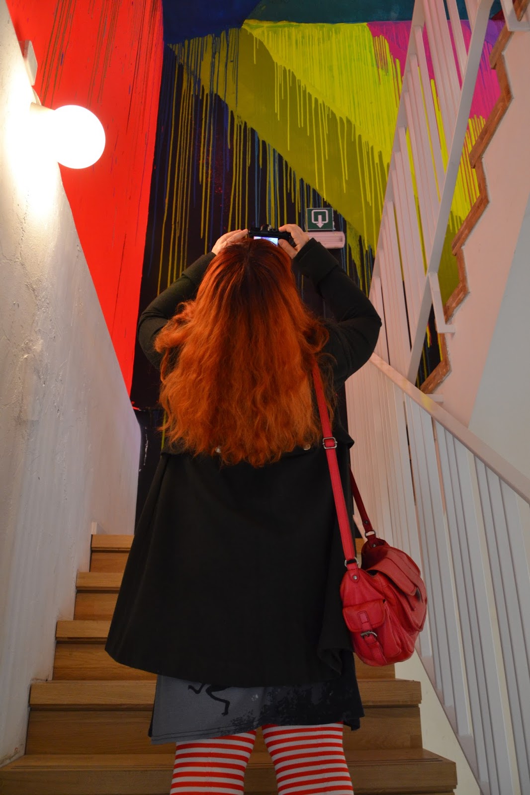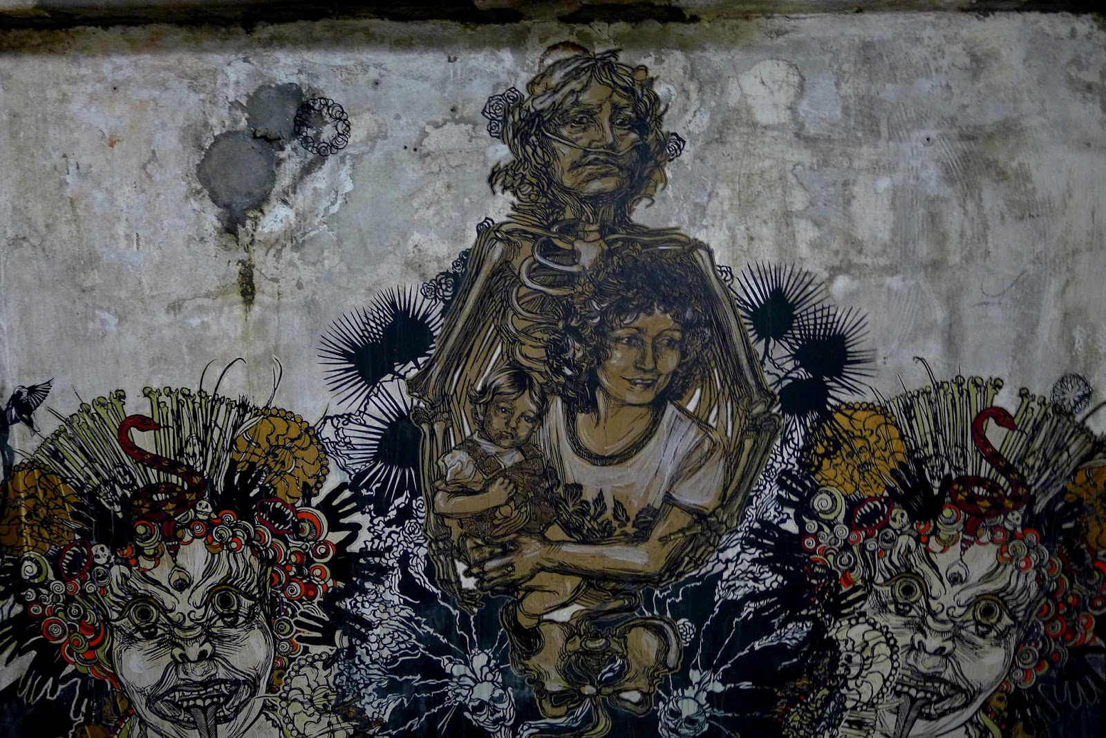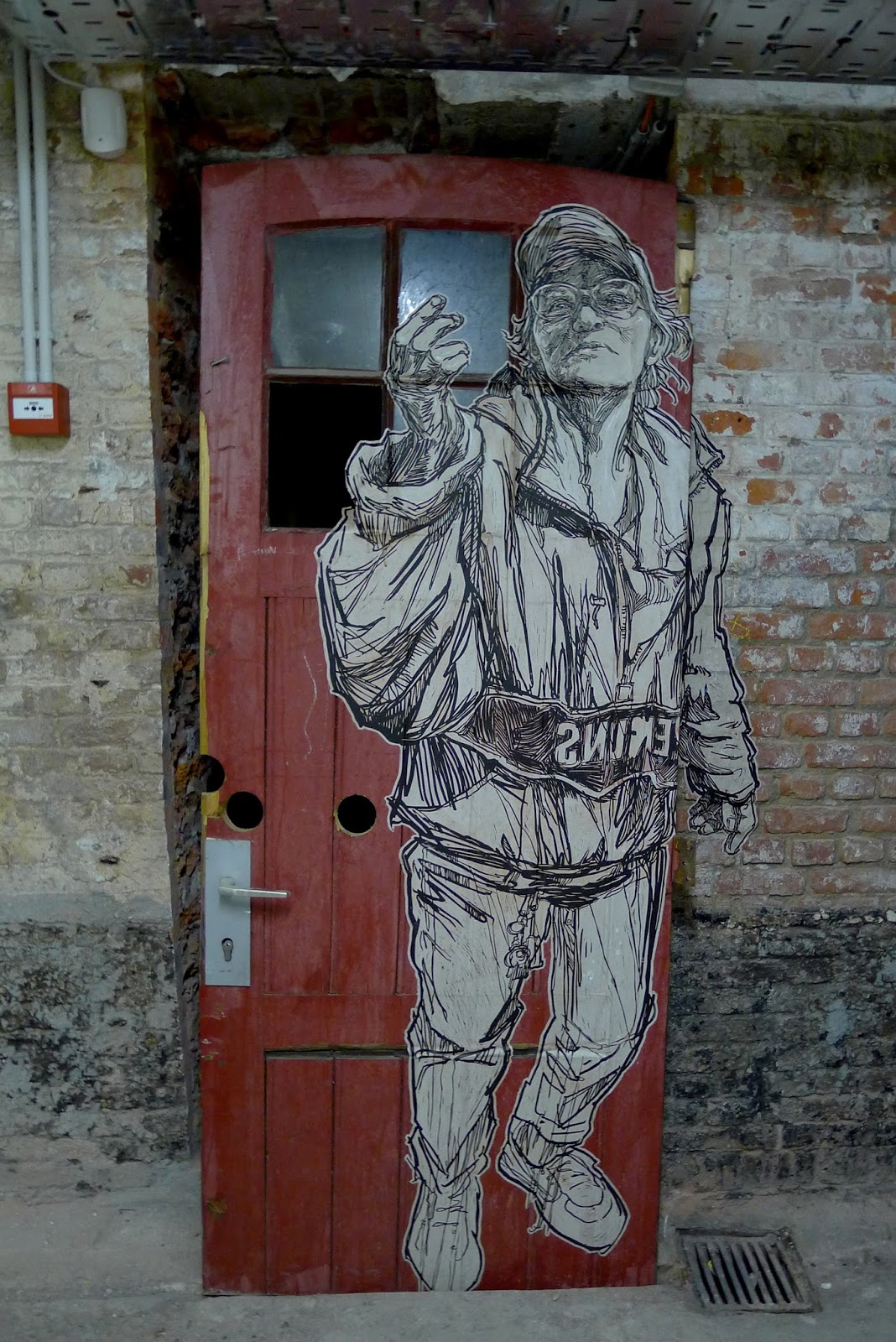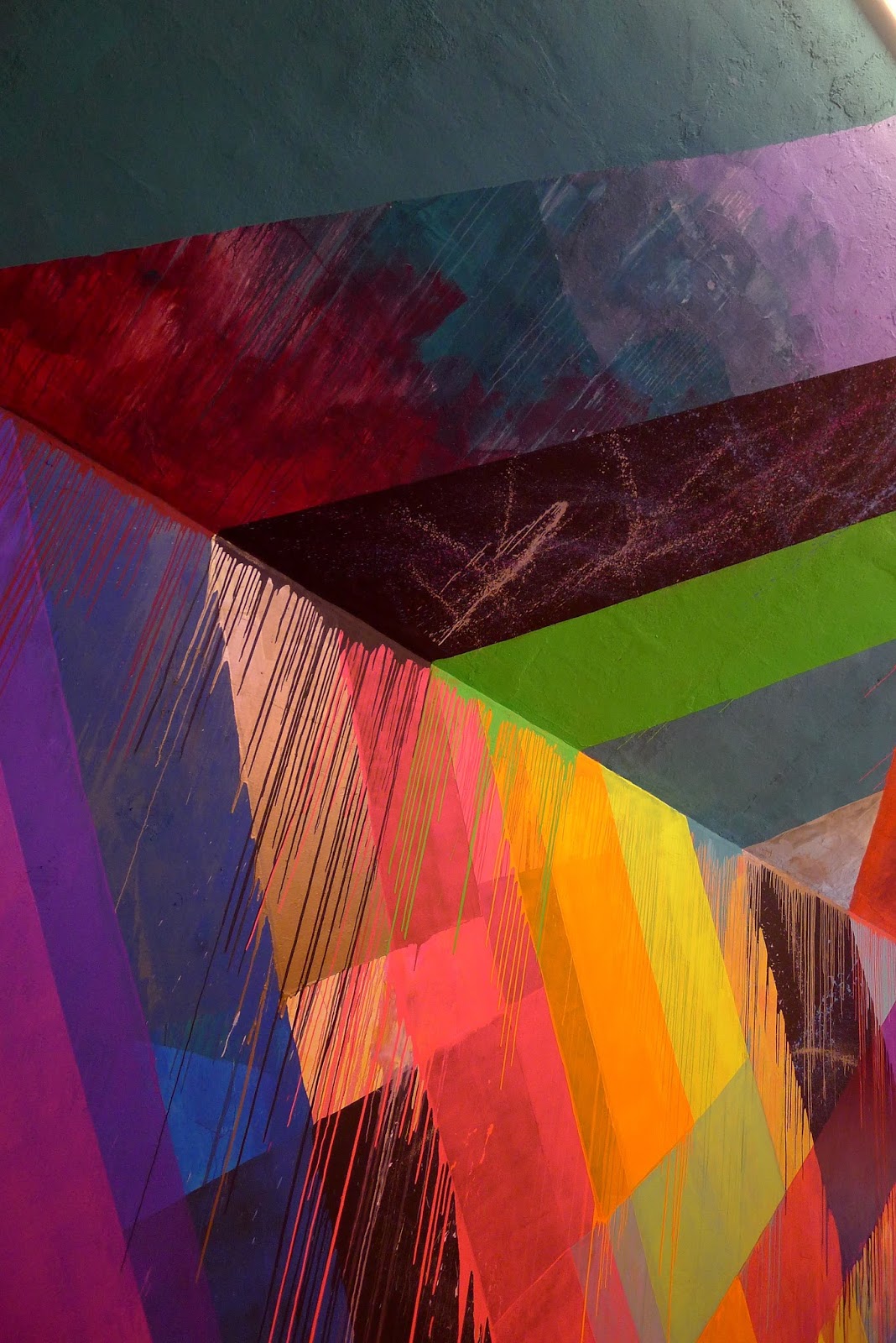 Passée l’entrée dans laquelle se trouvent une minuscule boutique et un resto-bar très agréable qui sert paraît-il de fabuleuses pizzas, nous avons commencé par descendre au sous-sol bien destroy où sont actuellement exposés les collages en papier de la street artist Swoon. L’adéquation entre lieu et oeuvres est absolument parfaite, et j’ai aimé traquer les motifs jusque dans les coins les plus reculés.