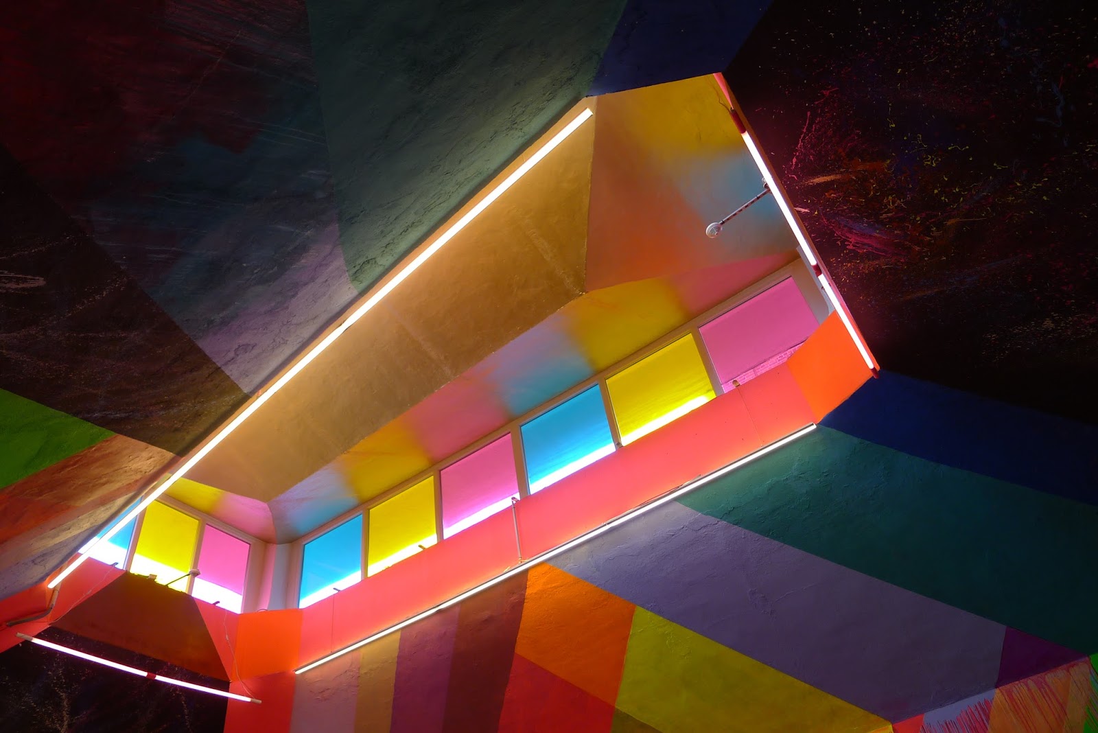 Au deuxième étage, on trouve la cathédrale de lumière colorée imaginée spécialement pour le MIMA par Maya Hayuk, et qui clôt l’exposition temporaire « City Lights » (visible jusqu’au 28 août). Le reste du deuxième étage et le troisième, auquel on accède par un escalier plein de charme mais extrêmement casse-gueule, sont consacrés à la collection permanente.